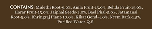 Amla (Emblica officinalis), aheda (Terminalia belerica), Harrar (Terminalia chebula), Jaiphal (Myristica fragrans), Bael phal (Aegle marmelos), Jatamansi (Nardostachys jatamansi), Bhringraj (Eclipta erecta), Kikkar gaund (Acacia arabica), Mulethi (Glycyrriza glabra), Neem (Azadirchta indica), Himalayan water Q.S.