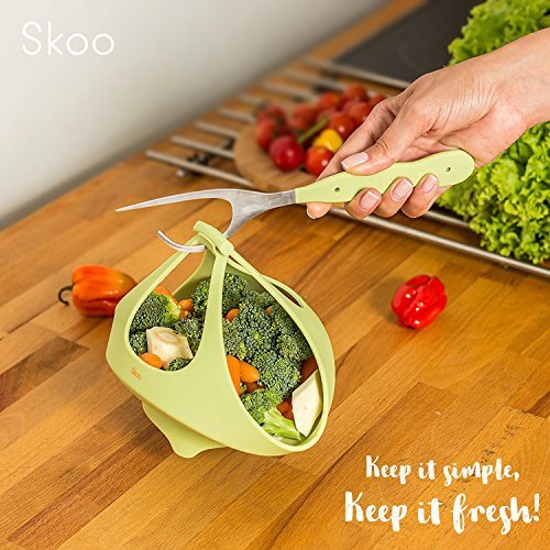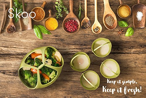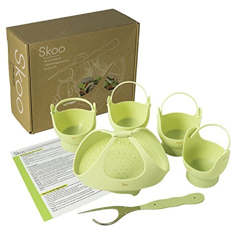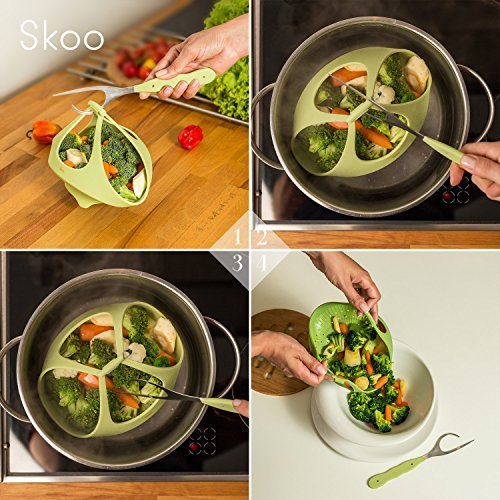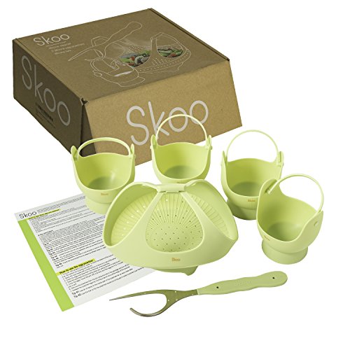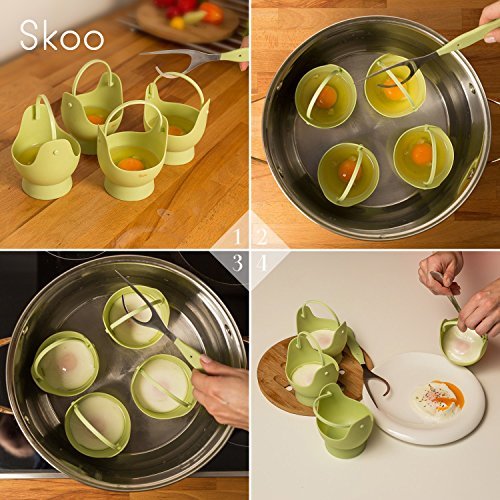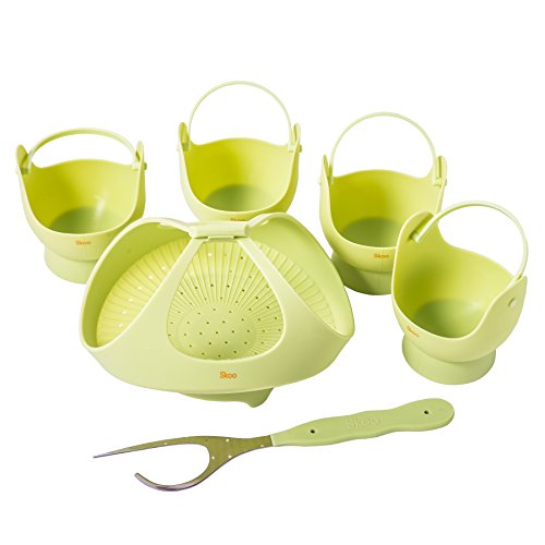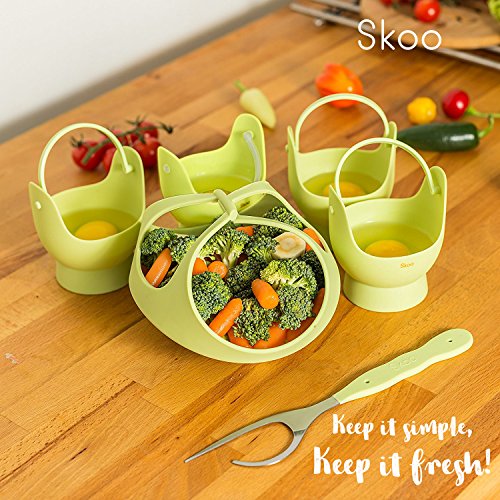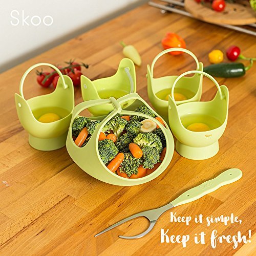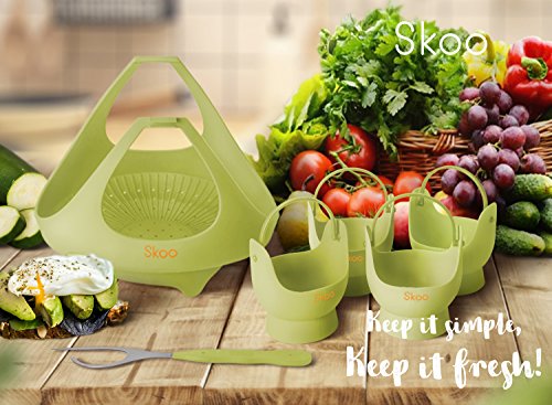 REDEFINE YOUR COOKING EXPERIENCE with SKOO PREMIUM SILICONE KITCHEN SET ! SKOO Premium Silicone Kitchen Set,with steamer ,4 egg poachers, fork and instructions included is designed to make steaming and poaching simple, fast and safe,is FDA aprroved, BPA free, eco friendly and non- toxic, dishwasher safe. The surface is designed for longevity and with a non-stick ability,still useing and oil spray on the inside surface of the cups is recommended. The temperature tolerance is 40°- 405° Fahrenhait (0°- 230° Celsius).The SKOO steamer has higher walls on each side to keep the content inside, adjustable close handles which makes it perfect for a two persons meal.The SKOO eggcups have a lot more stable base,rotatable handles and thicker silicone material.The SKOO silicone handled fork provides grip, to remove both, the steamer and the egg cups from the heat and to check contents during cooking.HOW TO COOK ?Just follow 4 simple steps as shown the pictures.Poaching eggs, steaming vegetables and fish does not only result in very tasty food, but it is the healthyest method available as it helps the ingredients retain their valuable nutrients better than other methods, such as oil cooking or simple boiling.Check the instructions list included ,see the recomended times for cooking vegetables and you will have your meal ready in 10 minutes!Put the list on the fridge or somewhere near the stove and you can check it anytime so you dont have to remember all the details.Use the fork to manoever the steamer and the poachers,also for checking contents and keep your hands by a safe distance from the heat. SKOO Premium Silicone Kitchen Set is a real help for cooking in a healthy and tasty way.Once you get it you will use all the advantages and benefits .Easy storage and clean,fast and healthy cooking SKOO will fulfill your needs.Best in silicone tools,Premium Quality for a tasty food, Best Value for the Money SKOO: KEEP IT SIMPLE, KEEP IT FRESH ! 0 |