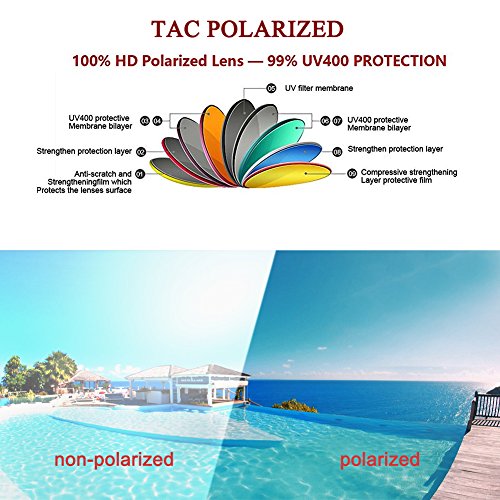 POLARIZED LENSES --- Specialized multi-layer lens designed to filter and block over 99% glare. Polarized sunglasses reduce glare reflected off of roads, bodies of water, snow, and other horizontal surfaces, to provide maximum comfort and visibility for outdoor activities.