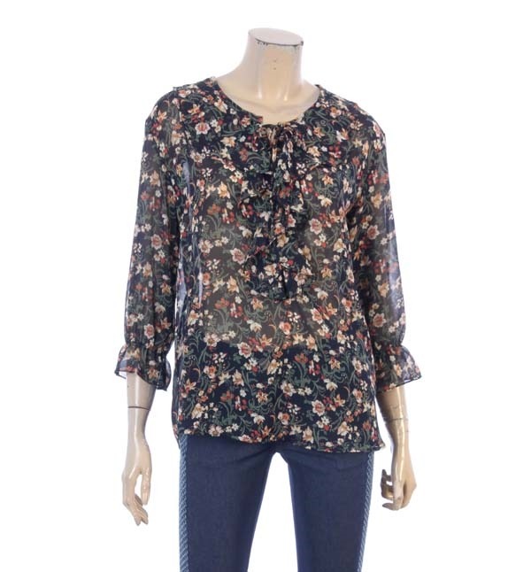 LYNN, 앞스트랩리본장식과 화려한 플라워 패턴이 돋보이는 여성스러운 느낌의 블라우스입니다