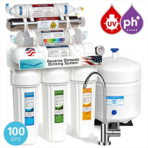 Included Components:Ultraviolet Sterilizer ◼ UV Bulb ◼ 4 gallon Water Storage Tank ◼ Tank Valve ◼ Deluxe Chrome RO Faucet ◼ Pressure Gauge ◼ All filters needed for setup (Sediment, Carbon Block, GAC, RO Membrane, Post Carbon, Alkaline) ◼ Filter Housings ◼ Leak Stop Valve ◼ Filter Housing Wrench ◼ Brass Feed Adapter Valve ◼ Quick Connect Faucet Adapter ◼ 22 feet of 1/4" color poly tubing ◼ Drain Saddle ◼ Teflon Tape ◼ Flow Restrictor ◼ Automatic Shut-Off Valve