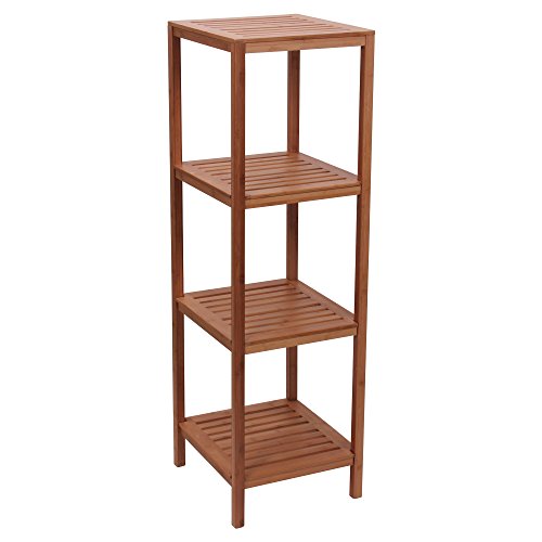 Household Essentials Bamboo 4-Shelf Cube Tower is a perfect little piece of furniture. This free-standing storage tower is rectangular--nearly square--and fits perfectly in corners or as a mid-wall shelving unit. Its shelving base is made of slats, set flush one against the other, for a sturdy, smooth surface. The spacious shelves have 12.5-inch vertical clearance, so they can easily be used as display shelves or even storage shelves for clothing stacks or storage bins. The 4-shelf storage tower is lightweight and sturdy--simple and attractive. It's the perfect addition to your home. The unit is 46.06 inches high, 14.96 inches wide, and 13 inches deep.