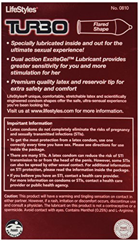 Lifestyles new TURBO Charged Condoms are specially lubricated inside and out for the ultimate sexual experience. Their premium quality latex and reservoir tip provides extra safety and comfort, while their unique ExciteGel lubricant delivers extra stimulation to her most intimate areas to achieve the ultimate arousal. Rev Up the Excitement!