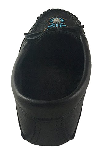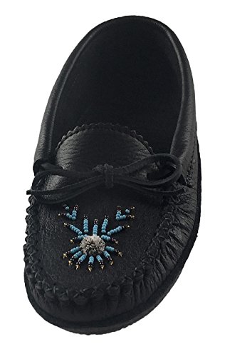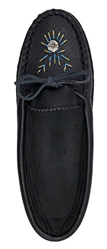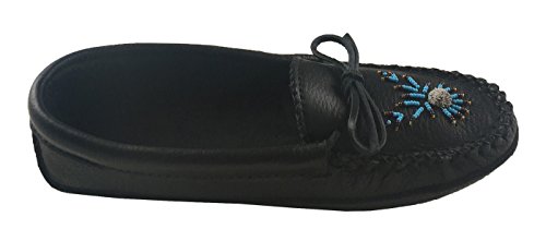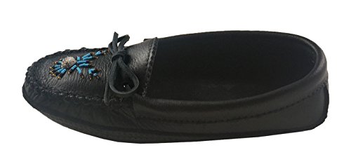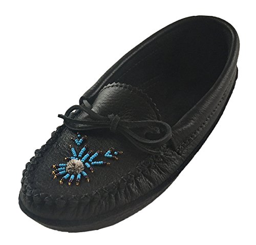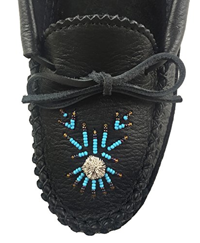 Binding : Apparel Product Description These ladies black moccasins are tradition in style and feature a fashionable Native Indian hand-beaded design on the vamp. They are handmade from durable genuine moose hide leather which is very durable yet nice supple in a chic black color. What makes them unique is the fashionable moose hair tufting and colorful hand-beaded design on the vamp. (note: bead colors may vary - variety of different colors) They are very comfortable and flexible as they have a double leather sole with a cushy foam in-between making them super comfortable to walk in. The interior is soft natural suede which feels great against your skin. They are best used as indoor house shoes. They handmade by Huron Native American Indians from Canada. These are quality moccasins and every detail is done with perfection. You can see this with the hand-sewn vamp that is double stitched. They come in women's sizes 5-10. 0