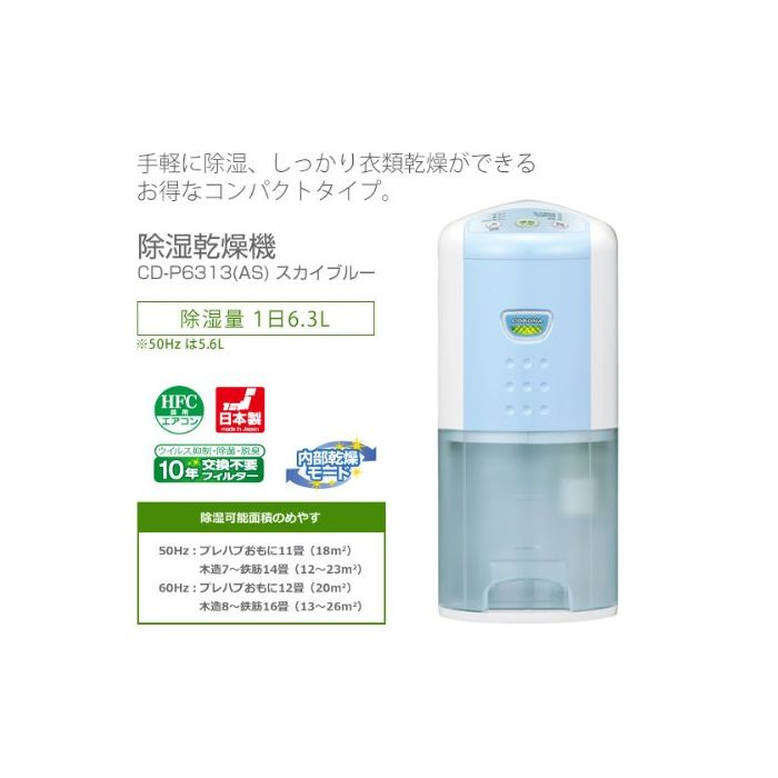 원본상품명: コロナ(CORONA) 衣類乾燥除?機 除?量6.3L(木造7??筋14?まで) 10年交換不要フィルタ?搭載 スカイブル? CD-P6313(AS)