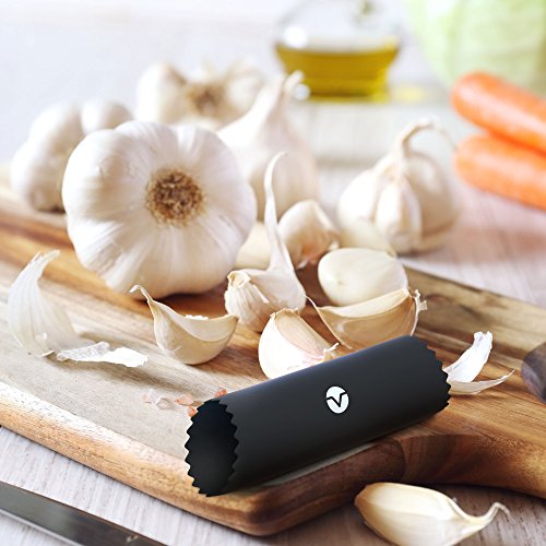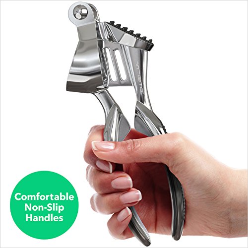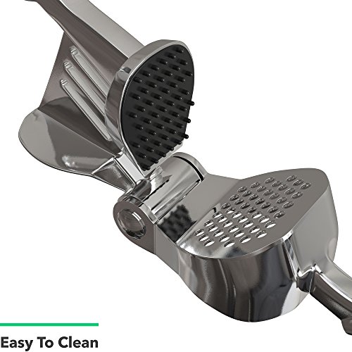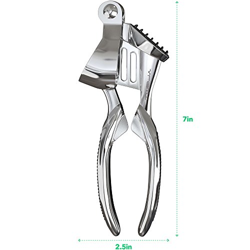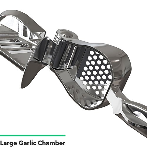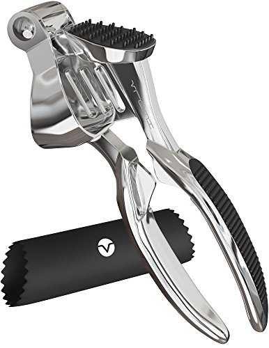 Studio : Vremi Publisher : Vremi Product Description Slay in the kitchen with Vremi's Clove Slayer Garlic Press. A convenient alternative to crushing that garlic or ginger without the smelly hands. This is made of heavy-duty zinc alloy with chromium coating, sturdy enough to handle any size of garlic clove you put in. Enjoy effortless pressing and crushing with its ergonomic curved design. You can even press unpeeled garlic and ginger without the mess, just simply reverse-flip the handle to eject the peel and you're done. Partnered with a food-grade silicone tube roller for unpeeled garlic cloves. If you are aiming for a fast and effortless way to infuse garlic in your meal, Vremi's Clove Slayer Garlic Press is the right tool in the kitchen. Product Details - 7-inch garlic press