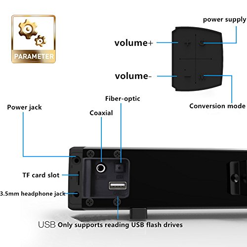 -. Feature : ♪Simple to use and bigger and better - Jiateng Soundbar 4.0 Bluetooth speaker supports button operation and remote control. You do not need complicated installation and operating procedures, you can directly select the speaker speakers connected to the desired mode. There are four 2.0-channel bass units with a total power of 40w, which will bring you and your home theater-level shock. / ♪Distortion-free stereo speakers with excellent sound quality and maximum volume- Stereo speakers support Bluetooth 4.0 mode. It connects to Bluetooth-enabled devices in seconds, saving you a lot of time. It also supports AUX mode, optical mode, coaxial mode, TF card mode and USB mode for maximum TV / PC / phone model compatibility. It delivers high-quality sound through fast, consistent media connections. / ♪beautiful bar design - Jiateng Soundbar 4.0 bluetooth speaker design concise but understated yet elegant. You can put it on the TV cabinet or wall, you can put it to your liking. When your friends come to your house and enjoy the party, they will praise you and say that you have made the right decision and your family will be happy with your shopping. / ♪ Strict Quality Control - The Jiateng Soundbar 4.0 Bluetooth speaker is made of iron mesh and eco-friendly PVC. It has a strong internal support structure and no sharp edges on the outside, so you do not have to worry about someone getting hurt by the sound bar speaker. At the same time, the structural design allows the speaker to be left intact in various accidental drops. / ♪ What You Get -If for any reason you do not like our products, please let us know immediately and we will refund your money or send you a replacement! Order now, no risk!
