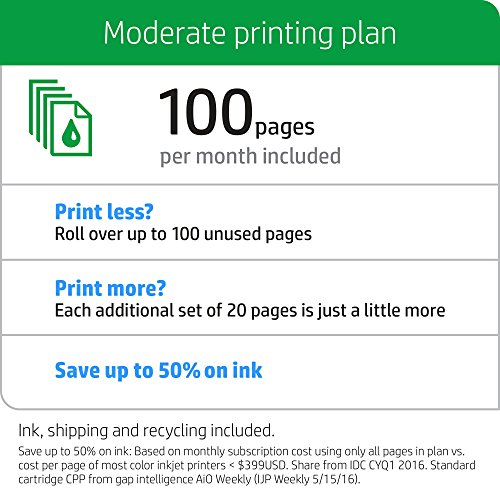ReleaseDate : 2016-07-08 Studio : Hewlett Packard SOHO Consumables Publisher : Hewlett Packard SOHO Consumables Binding : Office Product Product Description Add the $4.99/month plan for moderate printing. Includes ink, shipping and recycle. Save up to 50% on ink and never run out again. HP Instant Ink is an ink replacement service. Your printer orders Original HP Ink for you when you're running low, and we ship it straight to your door, so you can print whatever you want, whenever you want - worry free. If your printing needs change, you can change or cancel your plan online at any time. 0