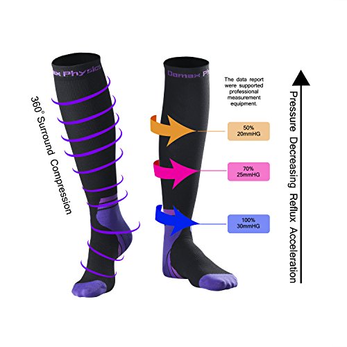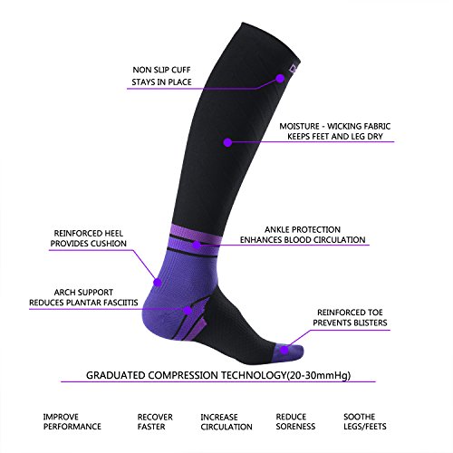 - [ IMPROVED BLOOD CIRCULATION ] – (20-30mmHg) Graduated compression socks 30 mmHG At The Foot & Ankle, 25 mmHG At Middle Of The Leg & Calf, & 20 mmHG Under The Knee. Provided blood oxygen circulation by socks helps reduce lactic acid build up and aids muscle fatigue recovery in your calf, ankle, feet, and legs.