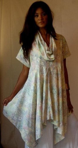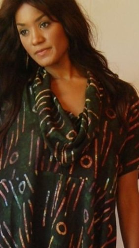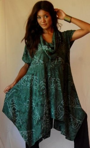 Binding : Apparel Product Description FABRIC : GOOD QUALITY RAYON BATIK Nothing comes close to a cowl neckline for adding a classy note of sophisticated design to your look. Except maybe an asymmetric angled hemline. And this top combines them both. Annie's designed this classy design with a softly draping cowl neck and a generously comfortable cut. Arm openings are in the side seams and when you wear it, it creates the appearance short, 'cap' sleeves. An encased drawstring below the bust creates an easy-to-wear empire waist, and the 'skirt' arcs out into an exaggerated a-line with soft pleats that add a touch of fullness to the front. The hemline arcs up at each hip and again in front and back and a pair of dangling points add a bountiful note of design. Overall length varies between 'just above' to 'just below' the knee on most. Made up in Lotustraders' Balinese batiks, the finest art-quality fabrics to be found anywhere. They're silky soft and a sensuous delight to wear. The sensuously lush drape of the fabric adds immeasurably to this design. Easy care, too, cold water wash, drip dry. Long enough to look great over leggings and classy enough to use for either casual or more formal occasions, this luscious top really does "do it all." And in the best of design. Available sizes (Small) (Medium) (One Size) (Plus Size) (1X) (2X) (3X) (5X) Made in Bali, Indonesia 0