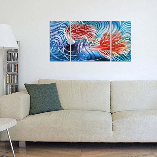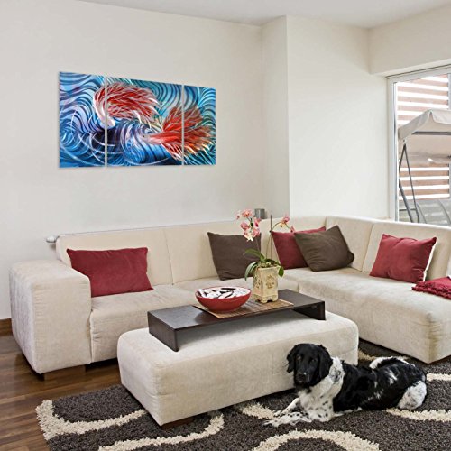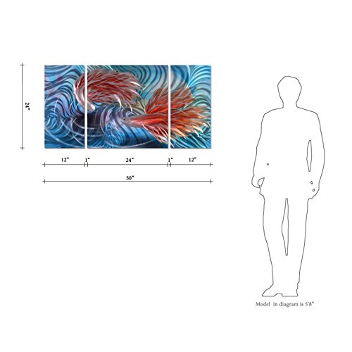 UNIQUE HANDCRAFTED METAL WALL ART. The most complimented, inspirational artwork you will ever own! Much more than a large painting -- it's stunning metal art wall decor. Creates mesmerizing 3-D beauty that pops from your wall and comes alive as the light changes. Abstract design and color on brushed aluminum color complement traditional, contemporary and modern decor. The size of this large 3-panel metal wall art is 50"x24". The inner panel is 24"x 24" and the two outer panels are 24" x 12".