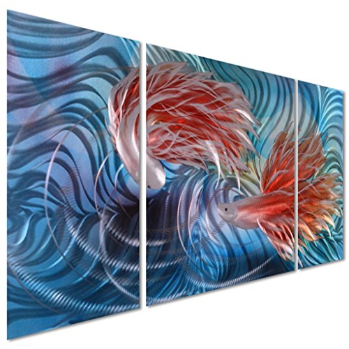 TROPICAL FISH LOVE METAL WALL ARTWORK DECOR - BLUE MODERN DECORATIVE NAUTICAL SEA ART SCULPTURE FOR KITCHEN AND BEDROOM - SET OF 3 PANELS 50" X 24"
