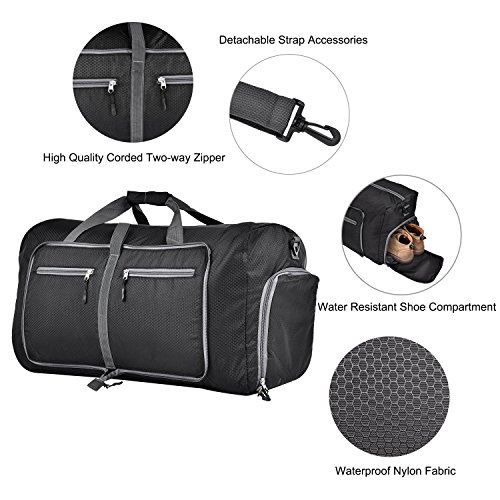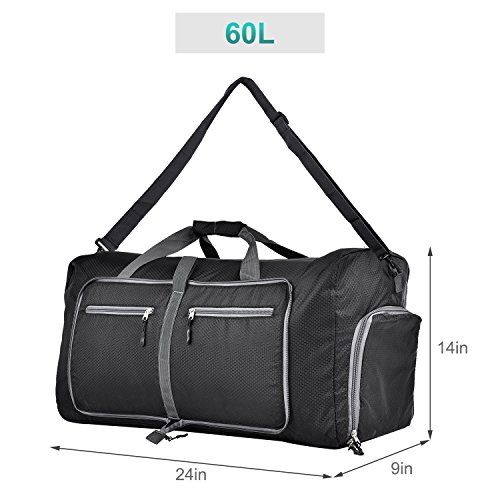 60L Weight: 1 lb Capacity: 60L Fold Size: 9.8 x 9.8 x 1.5 in Unfolded Size: 24 x 13 x 9 in 70L Weight: 1.1 lb Capacity: 70L Fold Size: 12 x 11 x 1.5 in Unfolded Size: 26 x 13 x 11 in 80L Weight: 1.2 lb Capacity: 80L Fold Size: 12 x 11 x 1.5 in Unfolded Size: 27 x 13 x 11.5 in Features Super Functional Packable Travel Storage Bag When unfold, it can be your travel duffel bag, gym bag, clothes storage bag. When fold, it become a very small bag to take with. Save weight and space. Water Resistant Nylon Fabric Be made of water resistant nylon fabric, no more worry about the water will infiltrate into the interior through the fabric. Water and Odor Resistant Shoe Pocket Water and odor resistant shoe compartment- to be used as a dirty laundry compartment as well. High Quality Zipper and Accessories Brand corded zipper to guarantee a long last performance. A removable shoulder strap to let you carry this duffel bag on shoulder .
