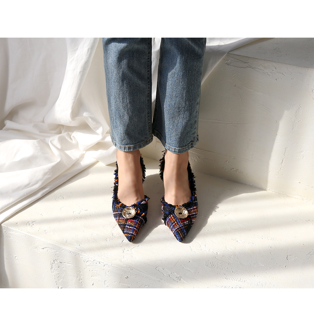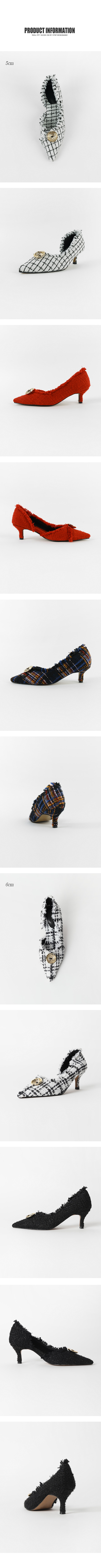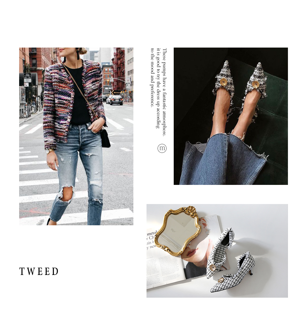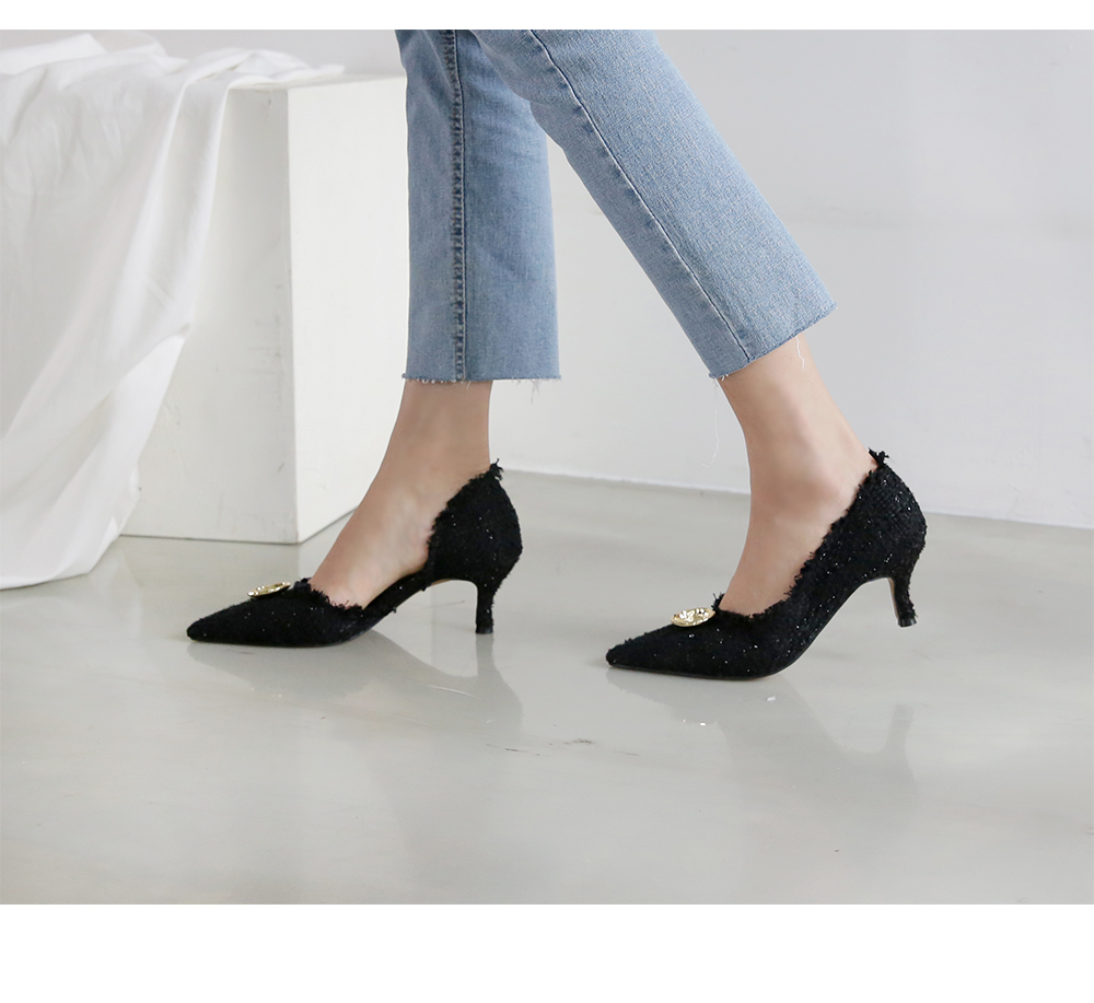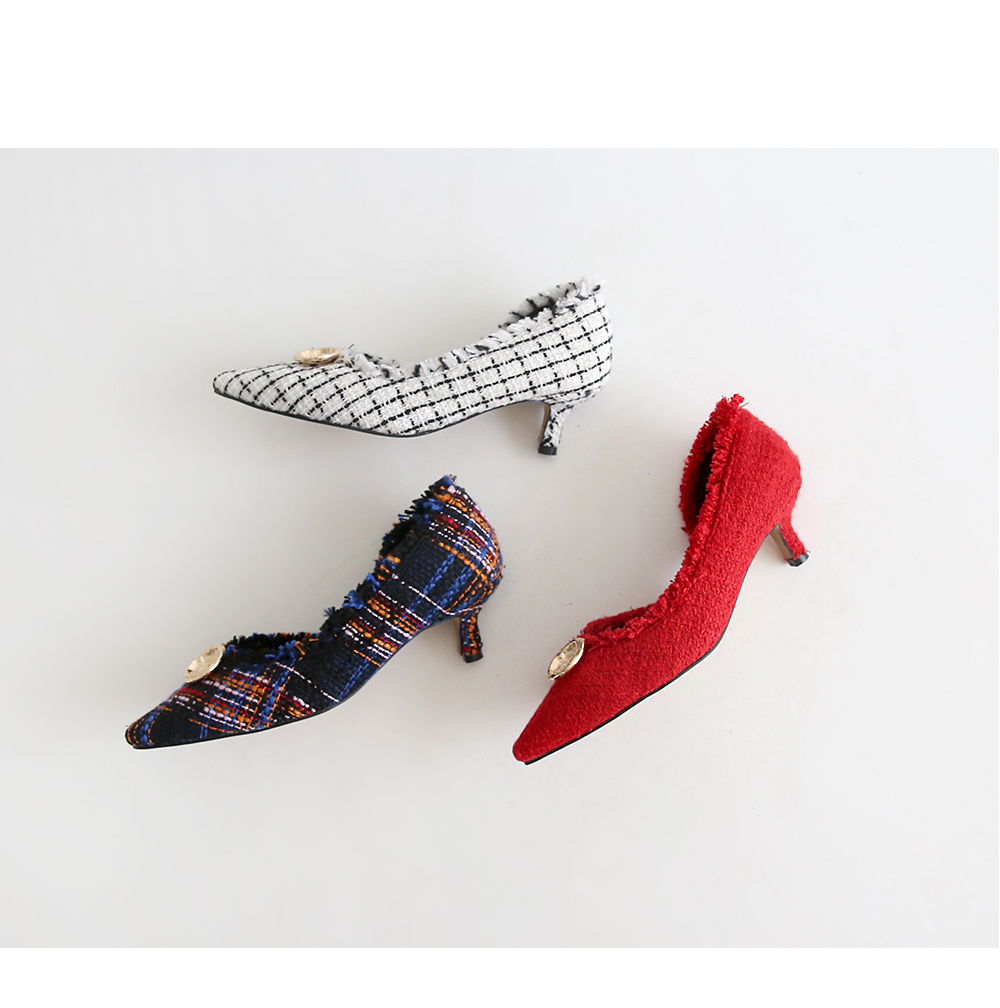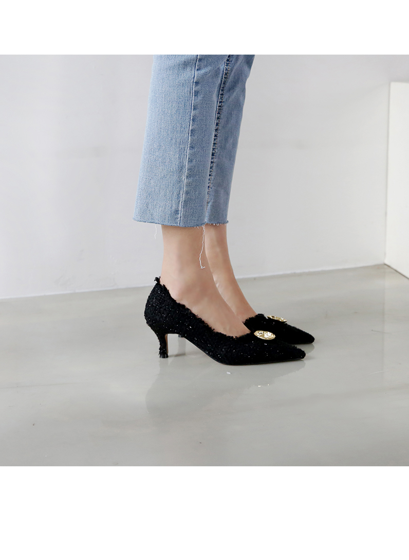 표면을 매끄럽지 않으나 매우 부드러운 트위드 소재로 디자인 된 미들굽의 펌프스입니다.