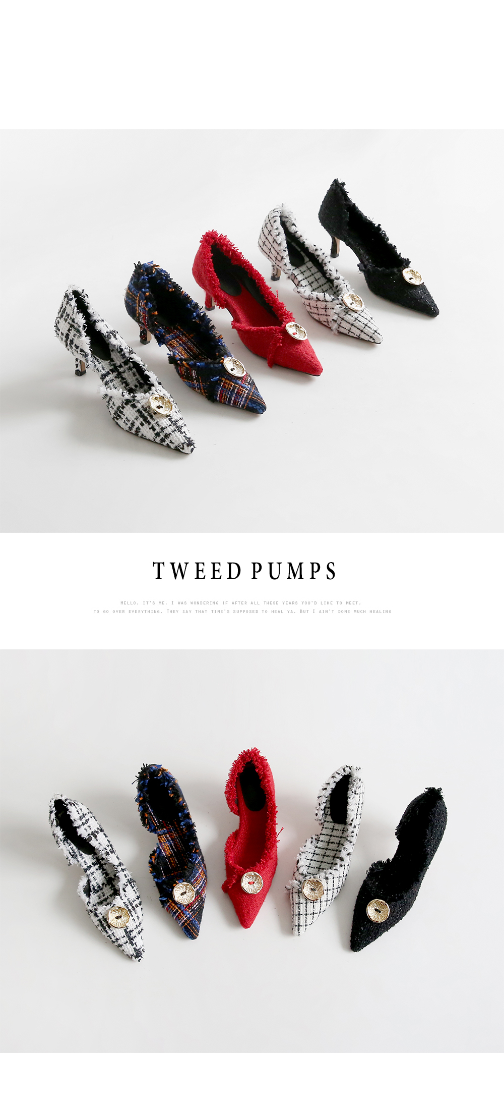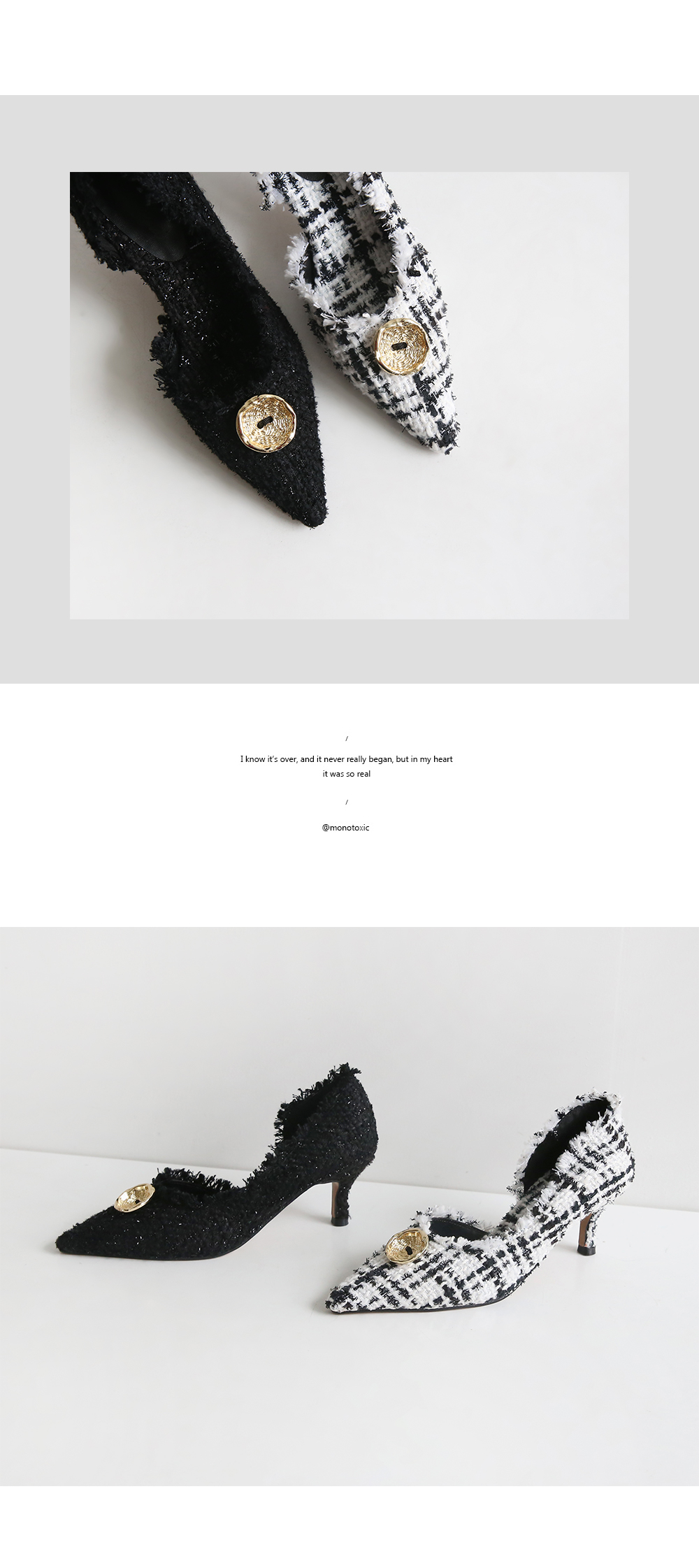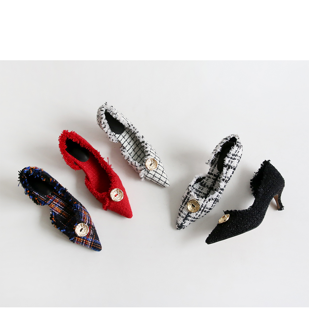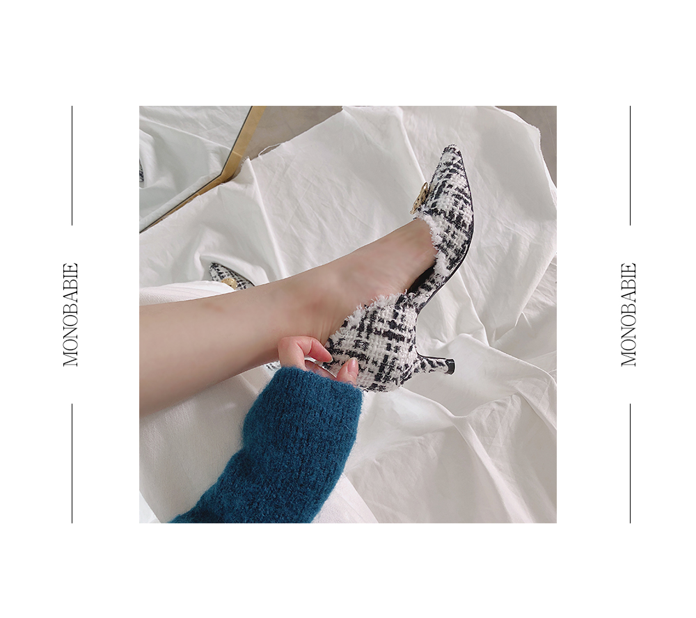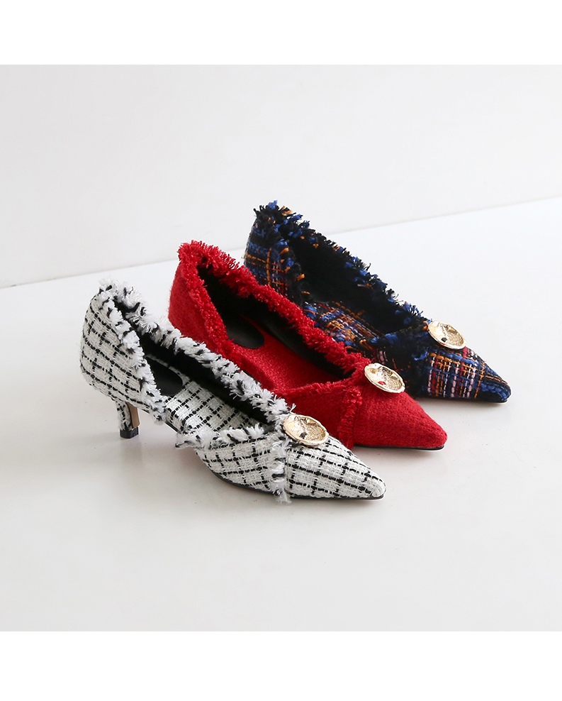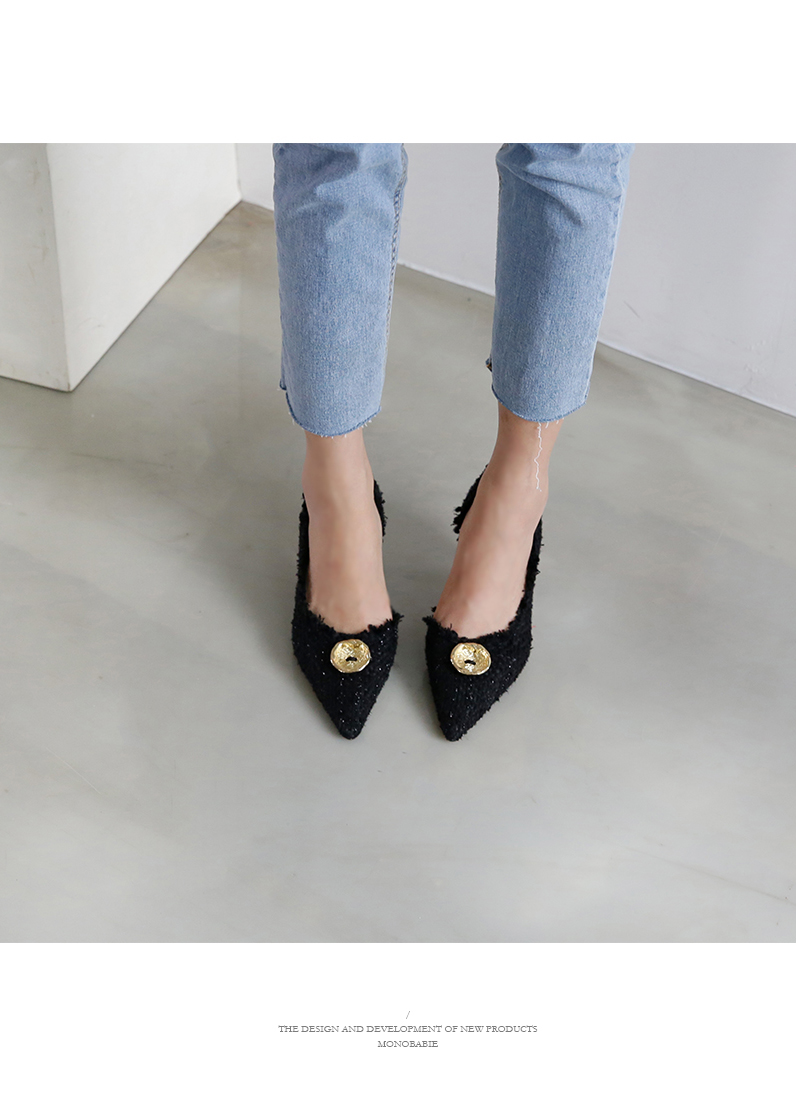 표면을 매끄럽지 않으나 매우 부드러운 트위드 소재로 디자인 된 미들굽의 펌프스입니다.