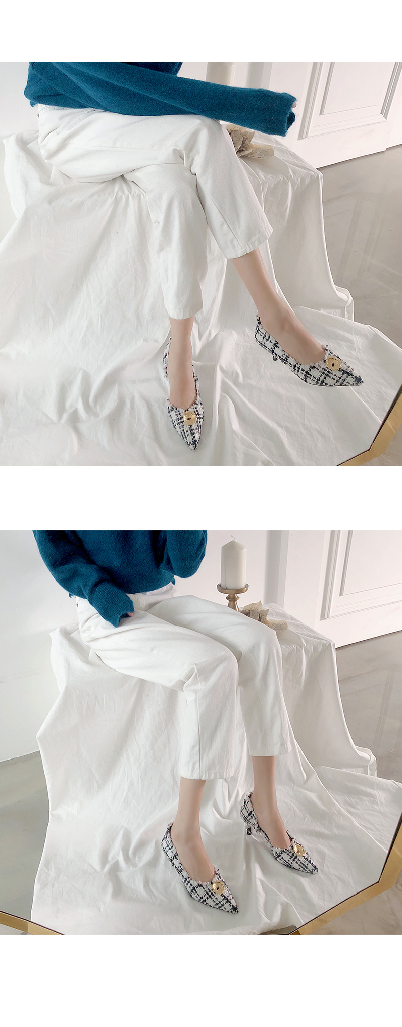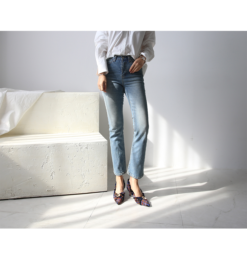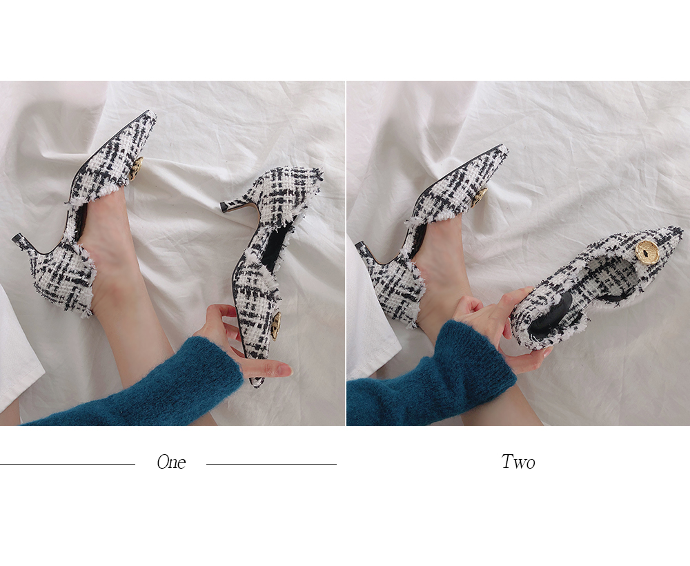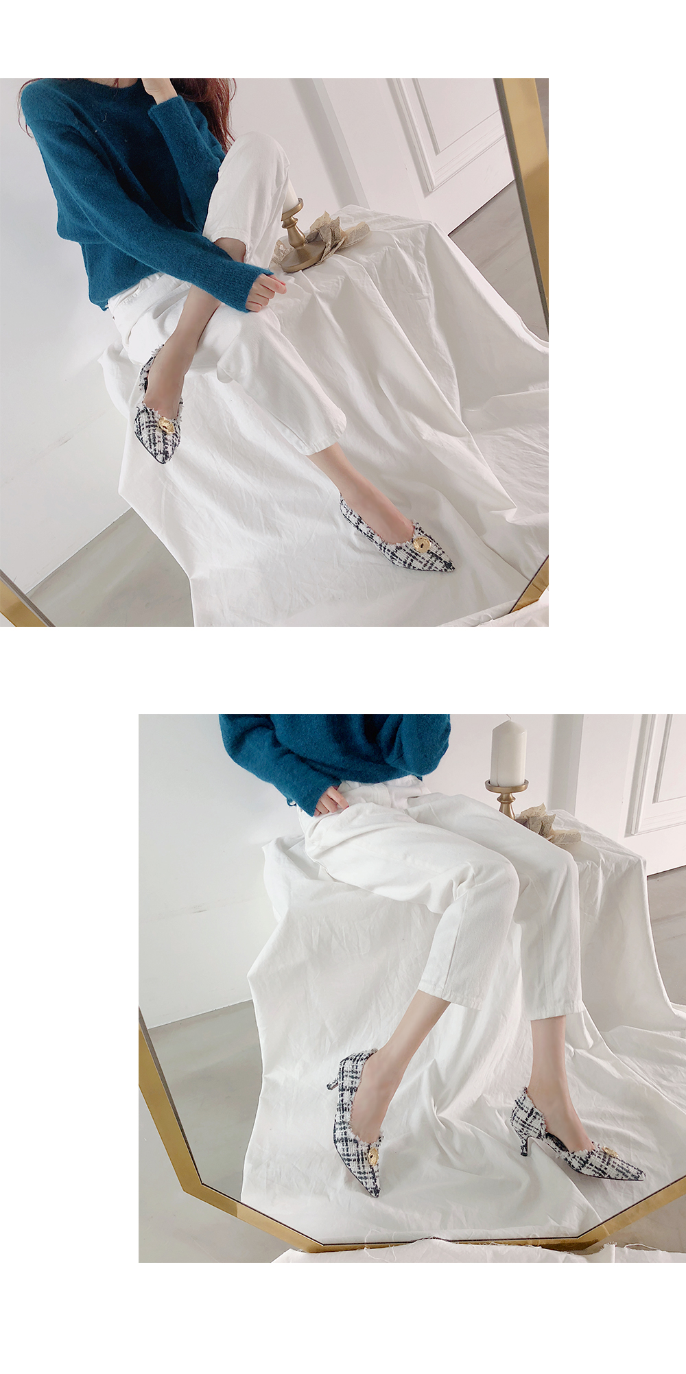두 가지 이상의 색을 사용하여 고급진 무드를 연출해주고 발등에 장식된 금속 장식이 여성스러움을 부각시켜주는 듯합니다.