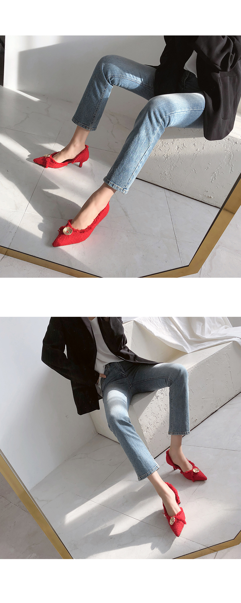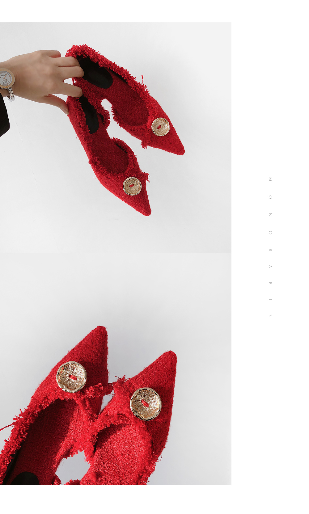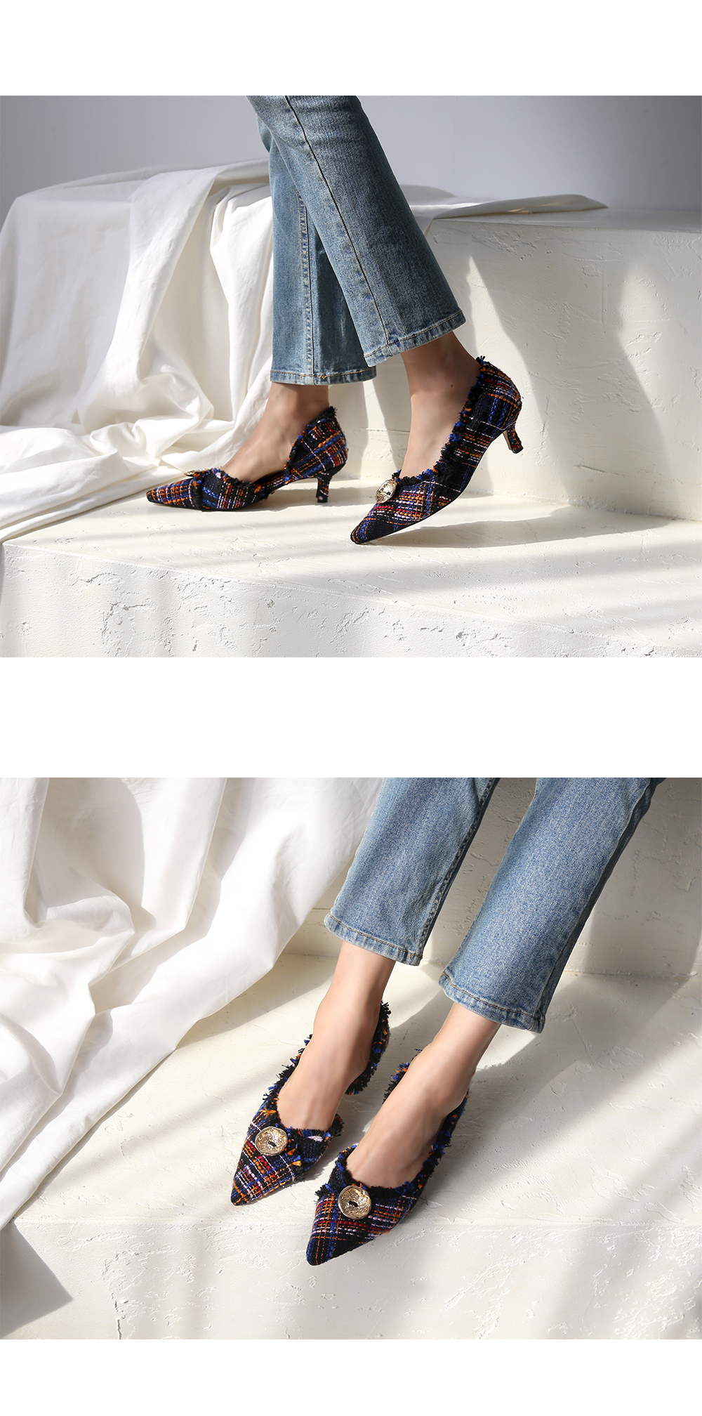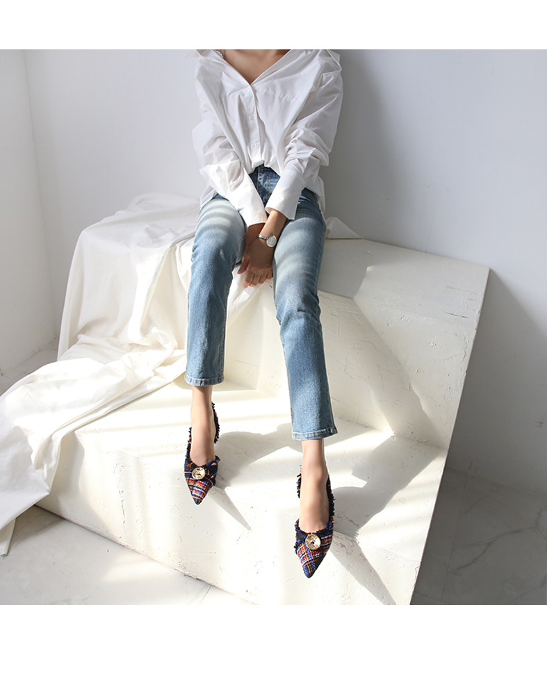 두 가지 이상의 색을 사용하여 고급진 무드를 연출해주고 발등에 장식된 금속 장식이 여성스러움을 부각시켜주는 듯합니다.