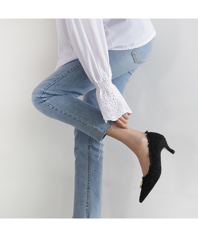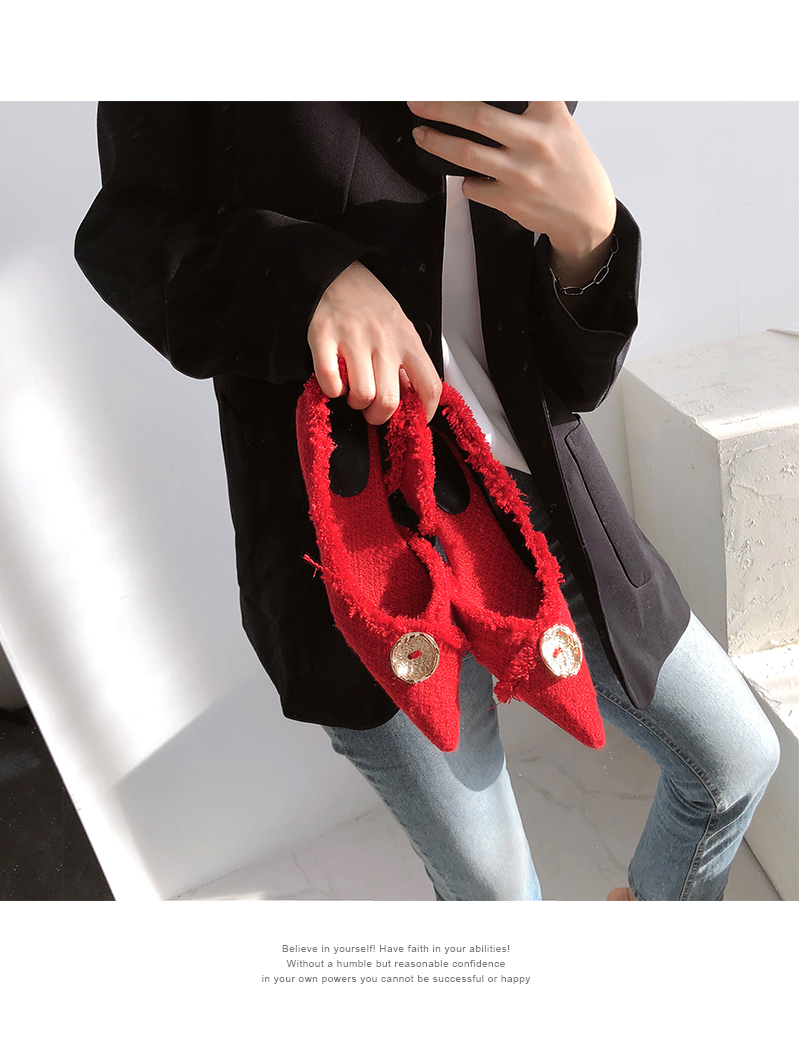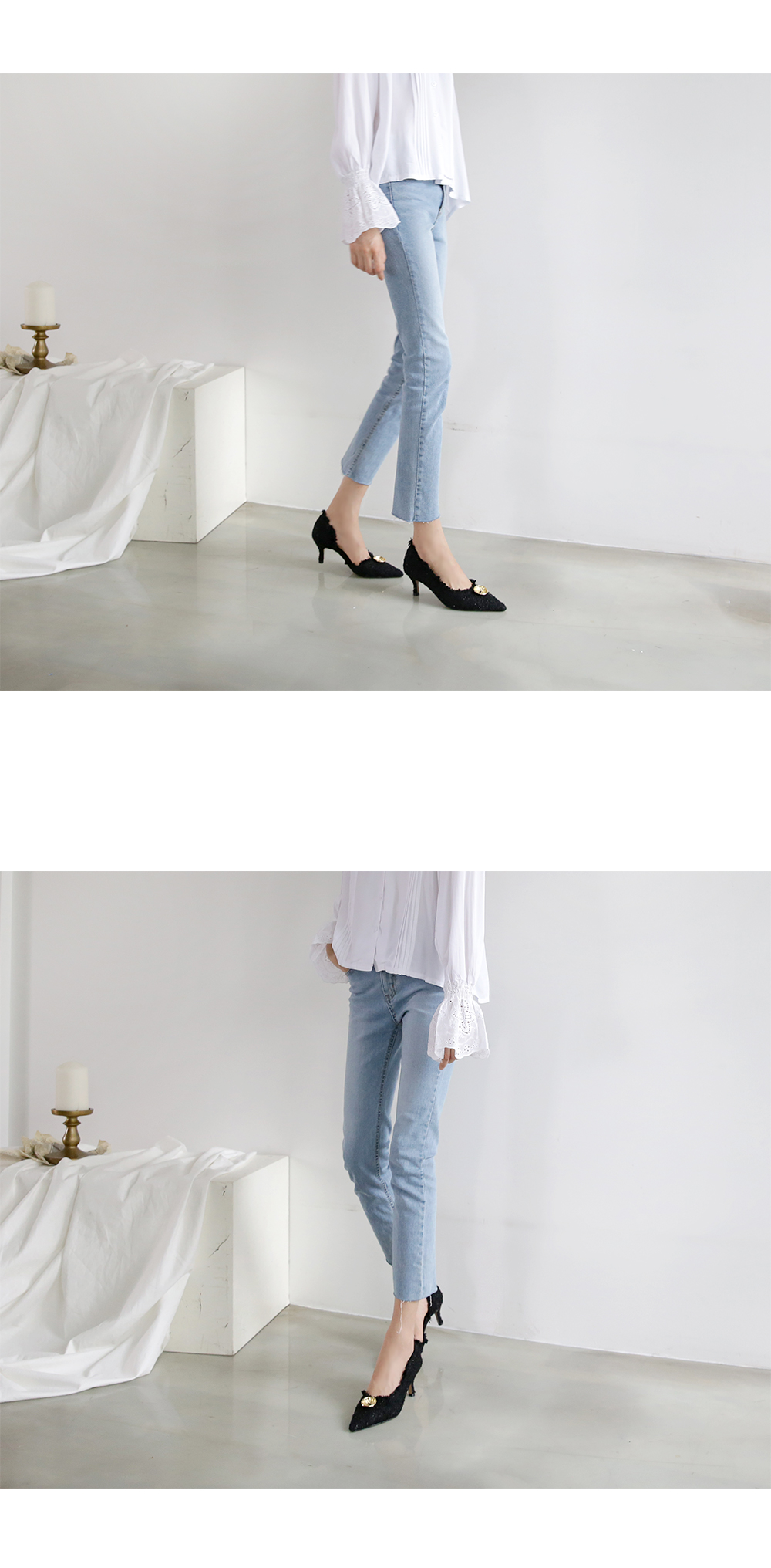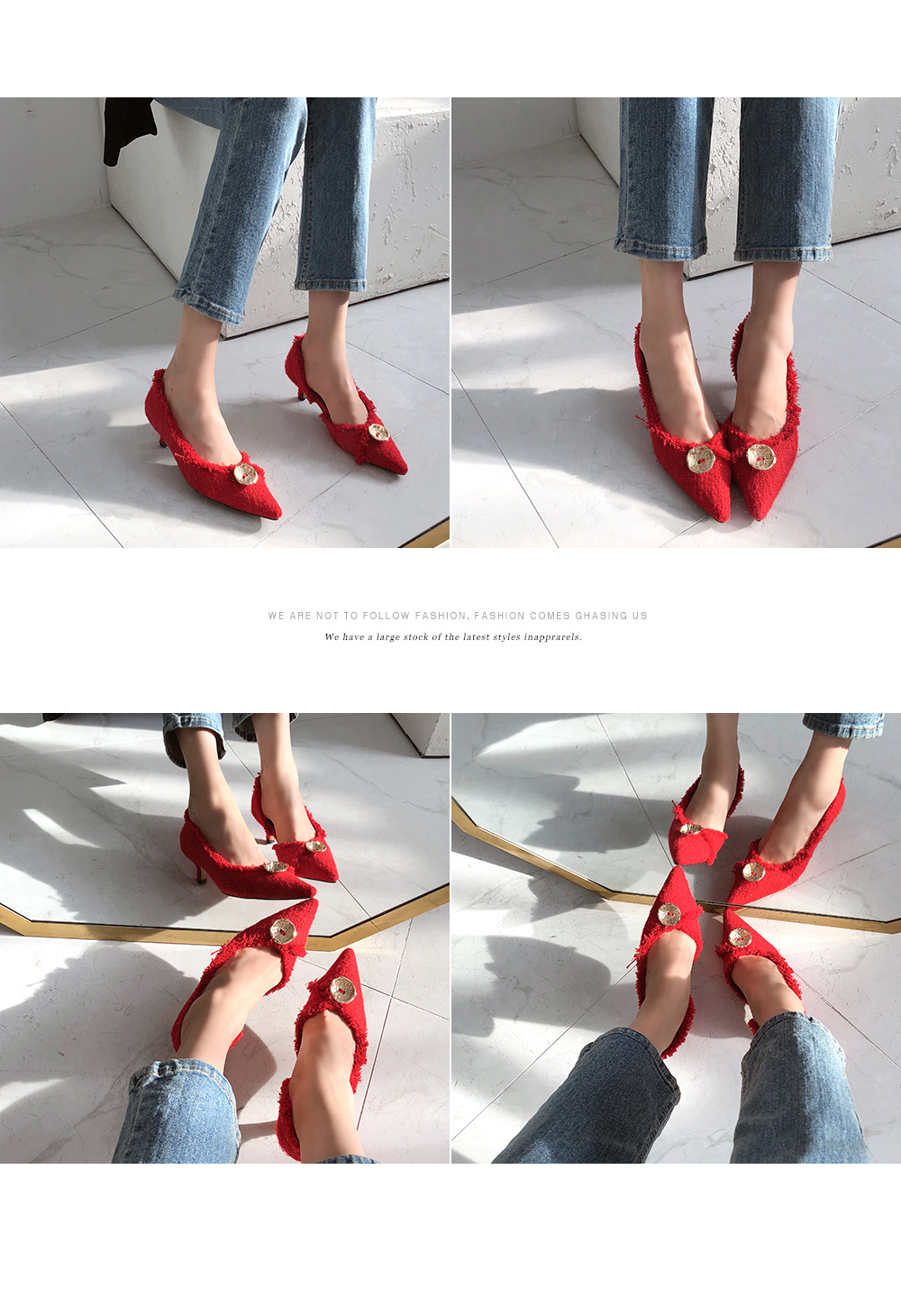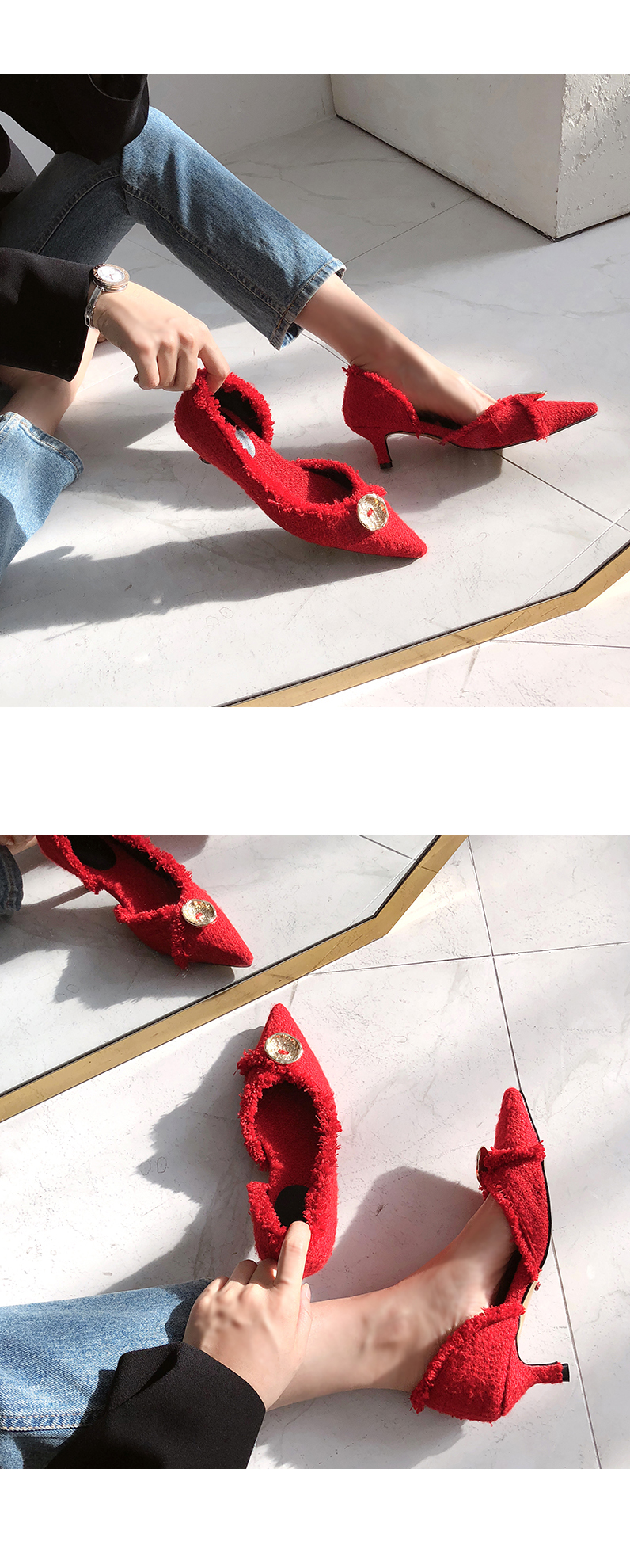 두 가지 이상의 색을 사용하여 고급진 무드를 연출해주고 발등에 장식된 금속 장식이 여성스러움을 부각시켜주는 듯합니다.
