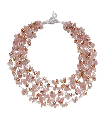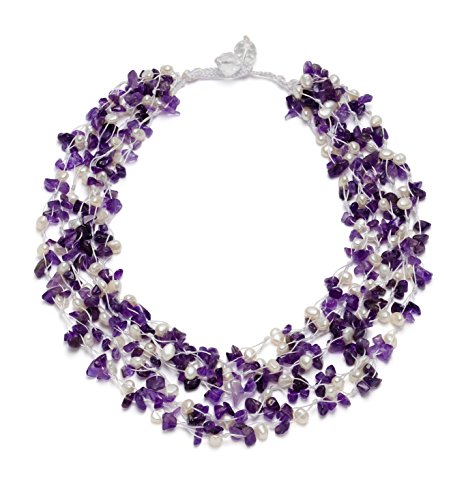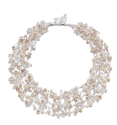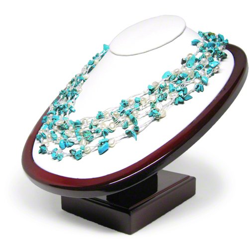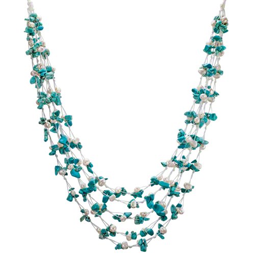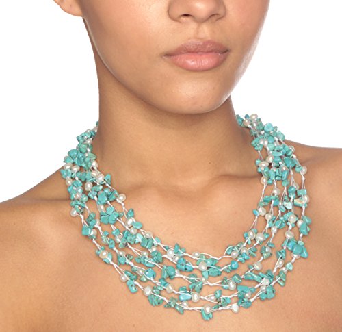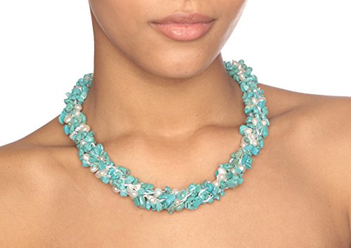 Southwestern elegance, boho flair. This beautiful handwoven HG design is composed of luminous white pearls and colorful turquoise chips. Kayla's radiant mix of shimmering pearls and light blue turquoise come together to make this complex design that's rich with color and texture. The turquoise pieces were chosen for their rich matrix patterns and lovely color. She is meticulously handwoven and finished with a faceted double bead toggle, and looks fabulous with both casual and more elegant attire. Wear her freely flowing or as a torsade twist to create two totally independent looks. Kayla is handcrafted from reconstituted turquoise chunks and genuine cultured freshwater pearls. Gemstones may have been treated to enhance their appearance and durability.Feature