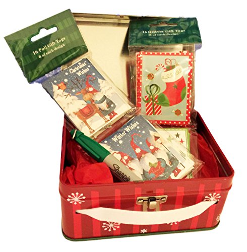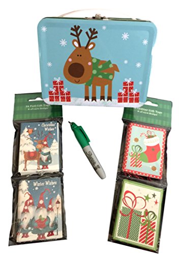 Christmas Holiday Glitter Gift Tags (32) featuring Reindeer, Elves, Presents and Stockings with Cute storage box and Marker