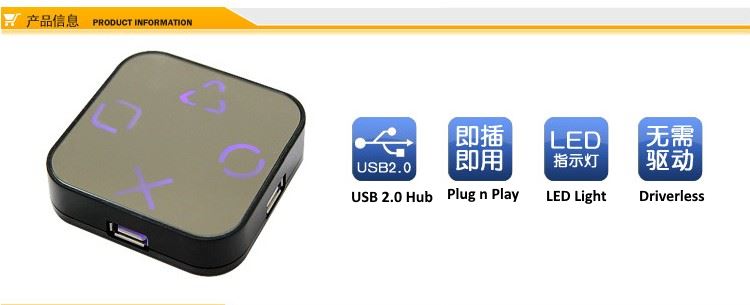 Name Kingshare KS-PHUBA4 High Speed USB 2.0 USB Hub Glass Surface LED Size (L x W x H) (CM) 7 x 2 x 7 (Cable Length: 80cm) 1 x USB 2.0 Hub