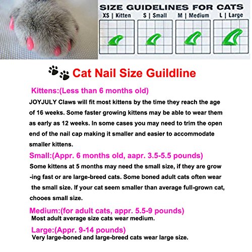Size Reference: Warm Tips: In some cases you may need to trim the open end of the nail cap making it smaller and easier to accommodate smaller kittens. The proper ways are: When you receive the nail caps, try one on first without the glue. If it doesn't fit, trim the open and of each nail cap until they fit your pet's claws snugly.