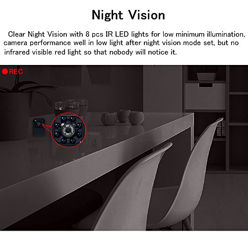 【Clear Night Vision】Clear Night Vision with 8 pcs IR LED lights for low minimum illumination, but no infrared visible red light so that nobody will notice it. Two buttons are easy to learn and operate the small camera.