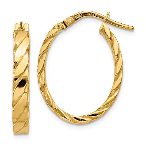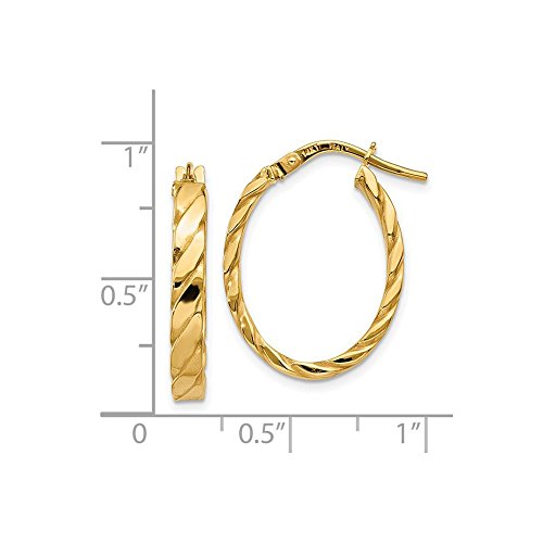 -. Title : 3 mm Patterned Oval Hoop Earrings in Genuine 14k Yellow Gold - 19 to 24mm
