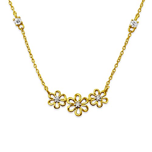 -. Feature : Material: Silver / Finishing: Gold Plated + E-coat / Necklace Length: 17.71in / 45cm / Cubic Zirconia: No. of Stones: 5 | Setting : Handmade Prong Setting / Flowers Size: 0.82in x 0.31in, 21mm x 8mm