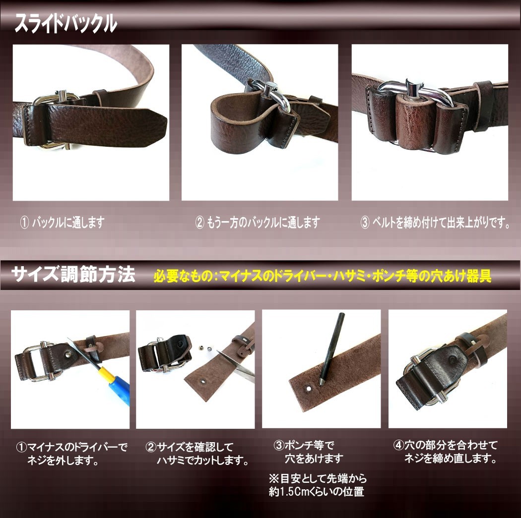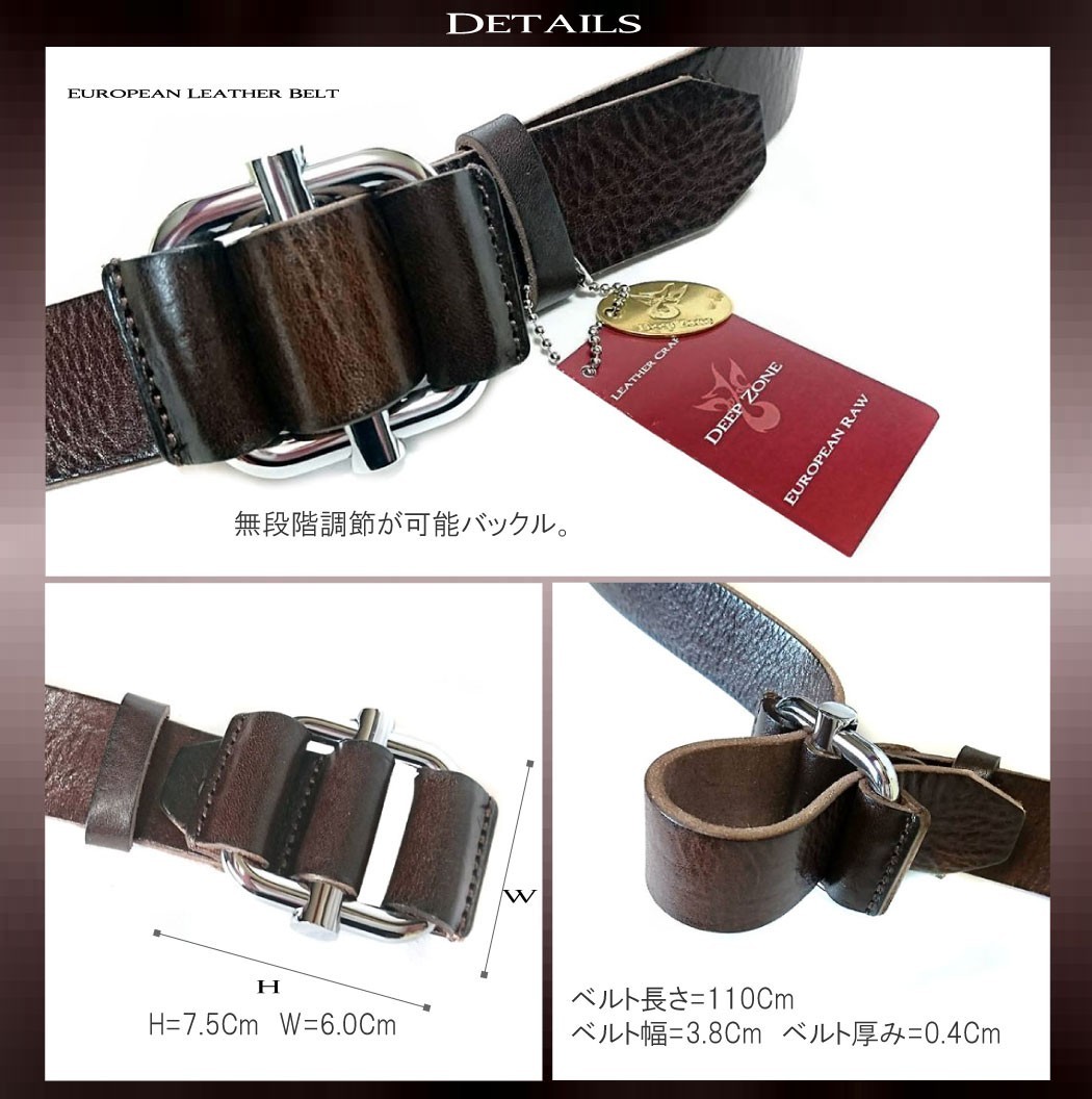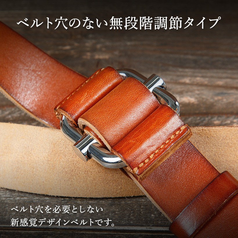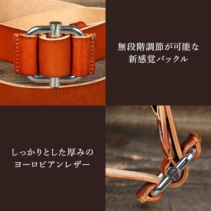欧州産の原皮を使用しております。高いクオリティのタンニン鞣しが施されており、ハリやコシもしっかりとある革になります。使い込めば使い込むほどに美しい飴色に変化していく為、非常に人気な一枚革のオイルレザーベルトです。穴を使用しないで留めるタイプのバックル無段階に調整できる機能性です。【素材】ベルト:牛革(欧州産原皮)バックッル:合金【サイズ】ベルト:長さ115cm 幅3.8cm 厚み:0.4cm【仕様】着用許容範囲:105cmまでベルト穴のない無段階に調整可能【カラー】キャメル・ブラウン・ブラック