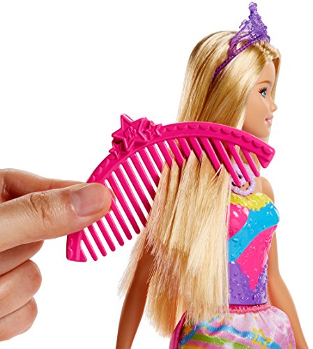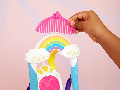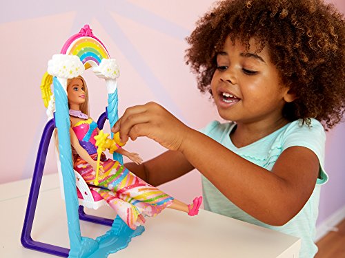 Barbie doll can rule her Kingdom of rainbow Cove from this unique throne that has some fantastically fun features -- it doubles as a swing, it hides a removable comb and it comes with a pet friend. Decorated with lots of rainbow inspiration, the colorful throne has a clip to hold a doll in the seat as it swings forward and backward. Pull out the hidden comb to style Barbie doll's hair. She wears a princess outfit with rainbow inspiration; a wand and tiara are royal accessories, and her pet puppy is so cute with a crown on its head. Play out all kinds of stories with this Barbie doll, throne/swing and accessories because when you enter dream top I a with sisters Barbie and Chelsea, you wake up to a world where dreams become reality.Feature