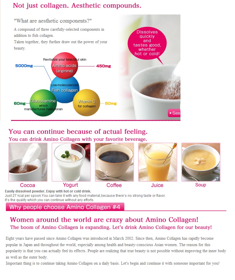 Setelah usia 20, Colagen dalam tubuh kita ini akan menurun secara drastis. Hal ini disebabkan oleh beberapa faktor, seperti : sinar UV Matahari & stress. Untuk tetap menjaga kecantikan, kita sudah harus mulai dari dini untuk mencukupi collagen dalam tubuh kita, salah satunya adalah dengan menggunakan supplemen AMINO COLLAGEN.