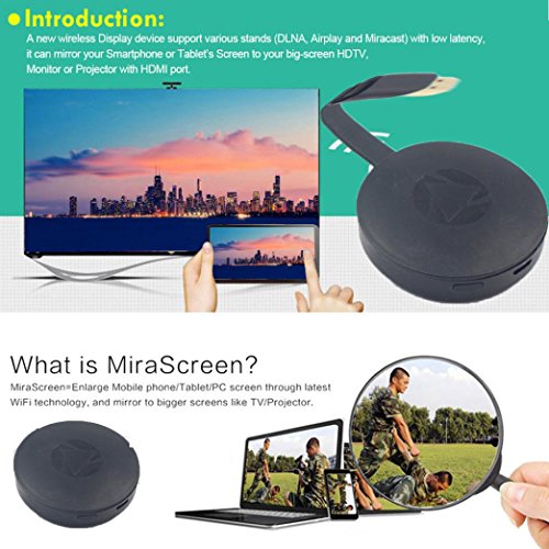 -. Feature : Support for mirroring content and Wi-Fi wireless streaming, no need for APP. / Enter the audio, image, and text on the TV and projector via the HDMI port. Compatible with DLNA / Mirracast mode, you can switch modes on different devices. / Easy to operate, support IOS and Android, support online automatic upgrade. / Wirelessly transfer content from your smartphone / tablet / laptop to a high-definition display device. / Package Contents: 1x stream adapter 1x cable 1x user manual