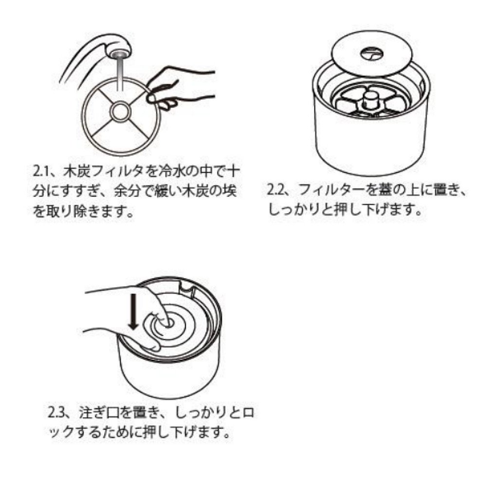 ご注意:フィルターのお手入れの際には、洗剤を使用しないで、水で表面の汚れを洗い流してください。フィルター交換時には、清潔を保つために必ず給水器本体各部を洗浄してください。活性炭フィルターの取り付けの向きは一方向だけです。