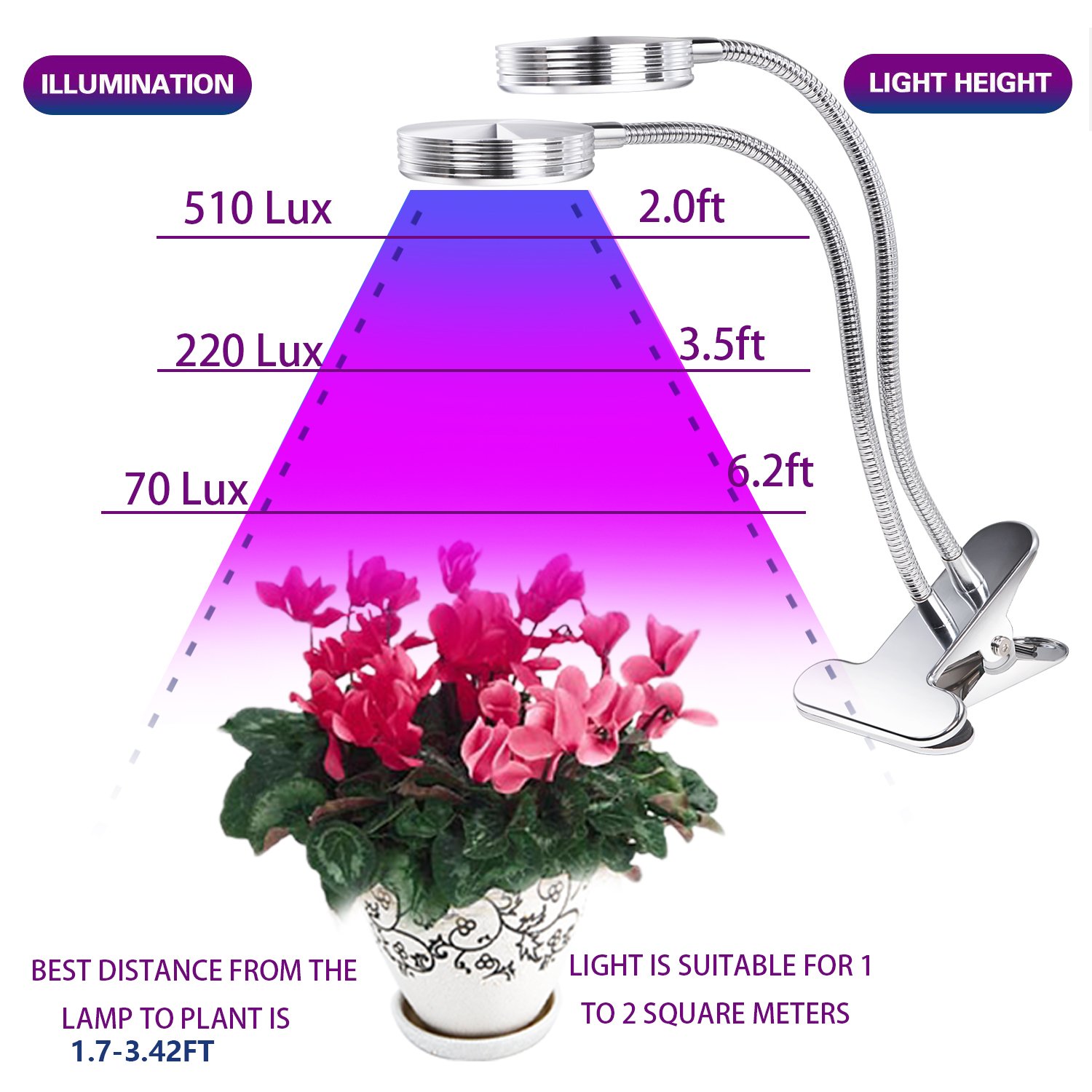 - DIMMBLE 2 MODES: You can switch the BRIGHTNESS of the light by using our dimmer control and adjust the distance between the light and plant according to plant needs. 16.14 inches height (410mm) (from base to head of lamp), Clamping range up to 3 inches, Cord length: 74 inches, Off/On switch button also on the dimmer switch