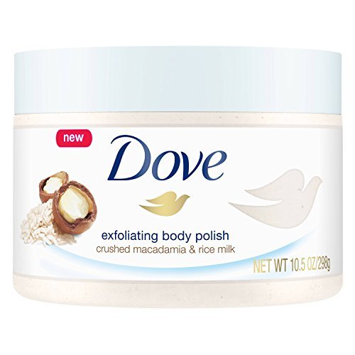 Scrubbing, sloughing, buffing: renewing skin doesn't have to be as rough as it sometimes sounds. Polish your way to smooth, soft skin with something different - Dove Exfoliating Body Polish Crushed Macadamia & Rice Milk. Created with 1/4 moisturizing cream, this nourishing body polish cares for your skin as it exfoliates. Removing dull, dry skin from the surface, it leaves your skin feeling silky and smooth. Restore your skin's nutrients and indulge in this body exfoliator's rich, whipped texture that gives you a beautifully creamy coverage in the shower. And enjoy the velvety fragrance of crushed macadamia and rice milk as it fills your shower. Say goodbye to dull, dry skin - and hello to a rich, relaxing fragrance and skin you can't help but touch. Beautiful results, effortlessly. To use, scoop a generous amount of polish out of the jar. Massage Dove Exfoliating Body Polish all over your body in circular motions for creamy coverage, and then rinse away to reveal silky smooth skin. Use 3-4 times per week as part of your skin care regimen, followed by Dove Body Wash or Beauty Bar for touchably soft skin. Try our Dove Body Polish to get beach-ready skin, prep skin for tanning, or to help exfoliate skin before shaving to help prevent ingrown hairs.Feature
