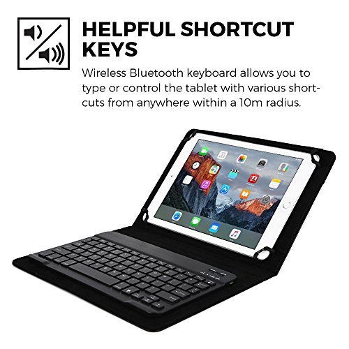 BEST SELLING BACKLIT BLUETOOTH KEYBOARD WITH 14 SHORTCUT KEYS - keyboard compatible with Android, Windows and iOS. 7 LED backlight key colors with varying brightness intensity. Easy setup Bluetooth automatically connects with tablet. Features 78 laptop-like keys; 14 shortcut keys to tablet's native functions; 10m range; 100 hour rechargeable lithium battery.
