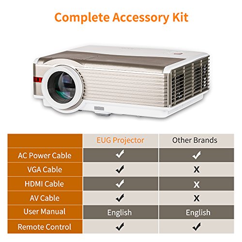 Package List: 1x Projector; 1x AC power cable; 1x HDMI cable; 1x VGA cable; 1x AV cable; 1x Remote controller; 1x User manual