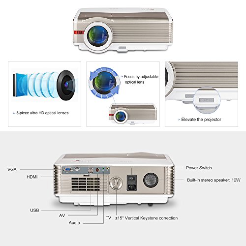 Compatible with multiple devices: VGA*1 port, USB*2 ports, HDMI*1 ports, TV, 3.5mm Audio jack, AV support connect Android device, iOS device, PC, laptop, tablet, TV, USB flash drive, SD card, game console, DVD player, Camera etc.