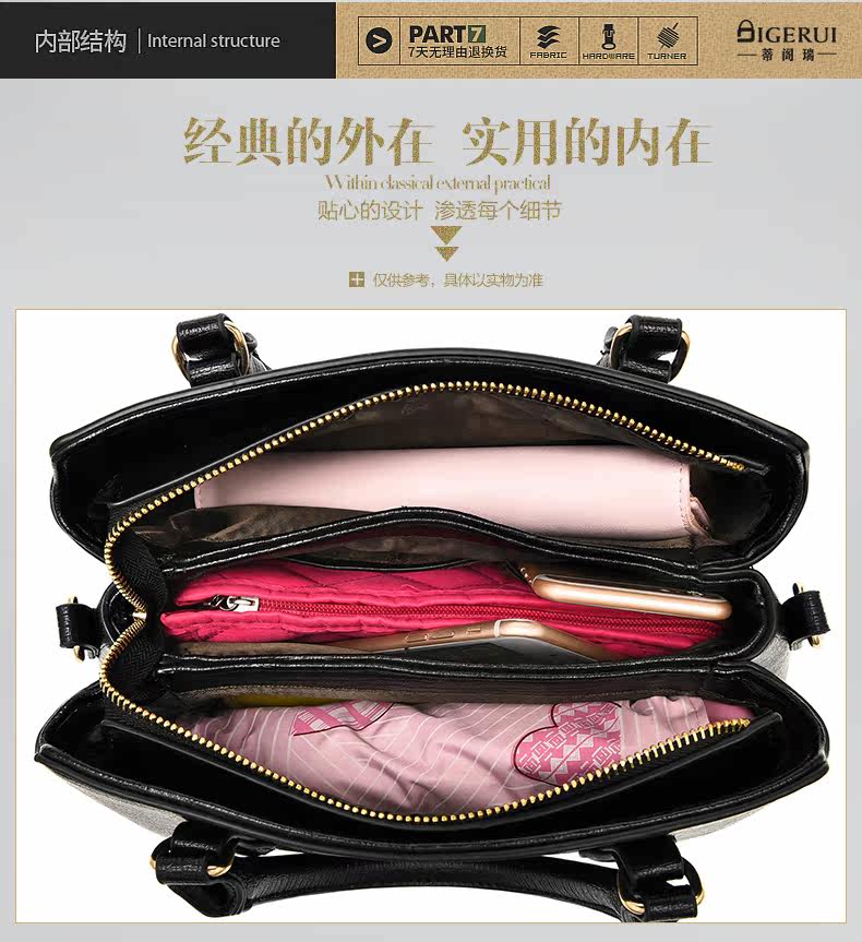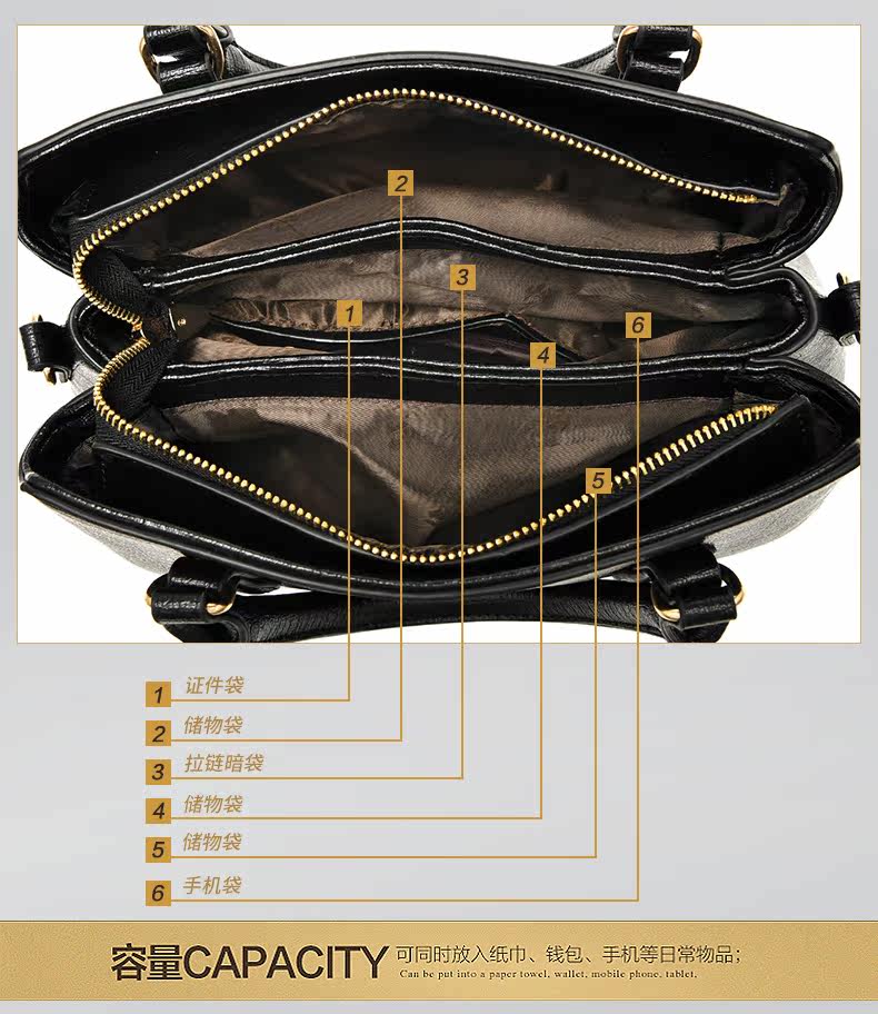 - 内部结构: 卡位 拉链暗袋 手机袋 证件袋 夹层拉链袋
