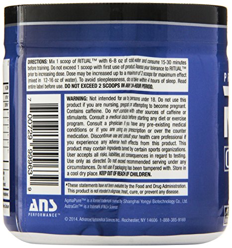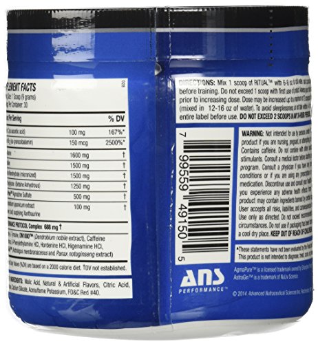 -. Binding : Health and Beauty -. Brand : ANS Performance -. Label : ANS Performance -. Manufacturer : ANS Performance -. ProductGroup : Health and Beauty -. ProductTypeName : HEALTH_PERSONAL_CARE -. Publisher : ANS Performance -. Studio : ANS Performance -. Title : ANS Performance Ritual Complete Pre-Workout Supplement