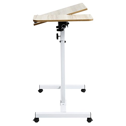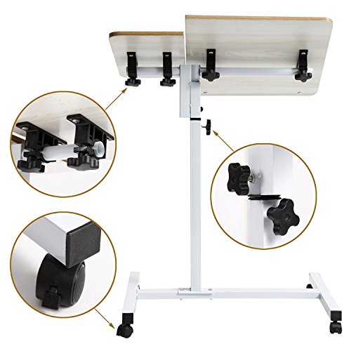 -. Feature : ✔Material: Wood and Metal, Desk features a steel frame for stability, durability and strength / ✔Desk Board Size: 23.6 x 15.6 x 0.4inch (L x W x T), Adjustable Height: 28.7- 35.8inch / ✔Feature: Manually adjust the desk's height and keep it there with the locking knob. A large main desk area with an independent side table fits full-size laptop computers and mice. The main table also tilts for maximum ergonomic comfort while computing or writing. / ✔Adjustable & Movable: Adjustable desktop design for tilting to the most comfortable angle for you need, Splitting tabletops into 2 adjustable shelves. Install the four 1.5-inch casters to enjoy the freedom of a mobile desk that goes where you do. Two locking casters ensure the desk stays put when you need it. / ✔Occasion: Sit-stand Laptop Car cart perfect for you using over sofa, bed, on floor or elsewhere when using laptop, reading or eating