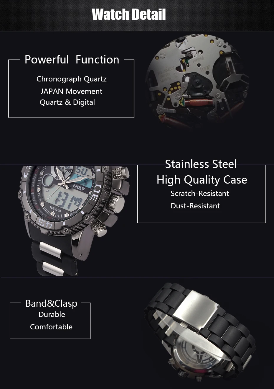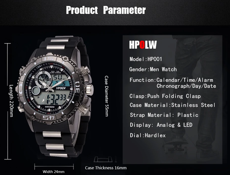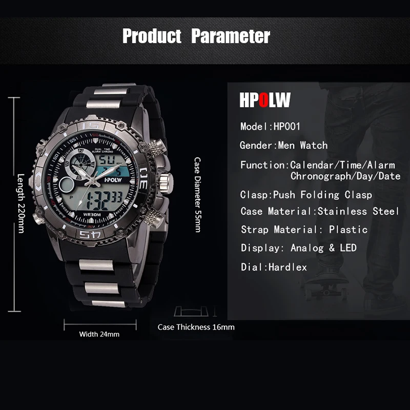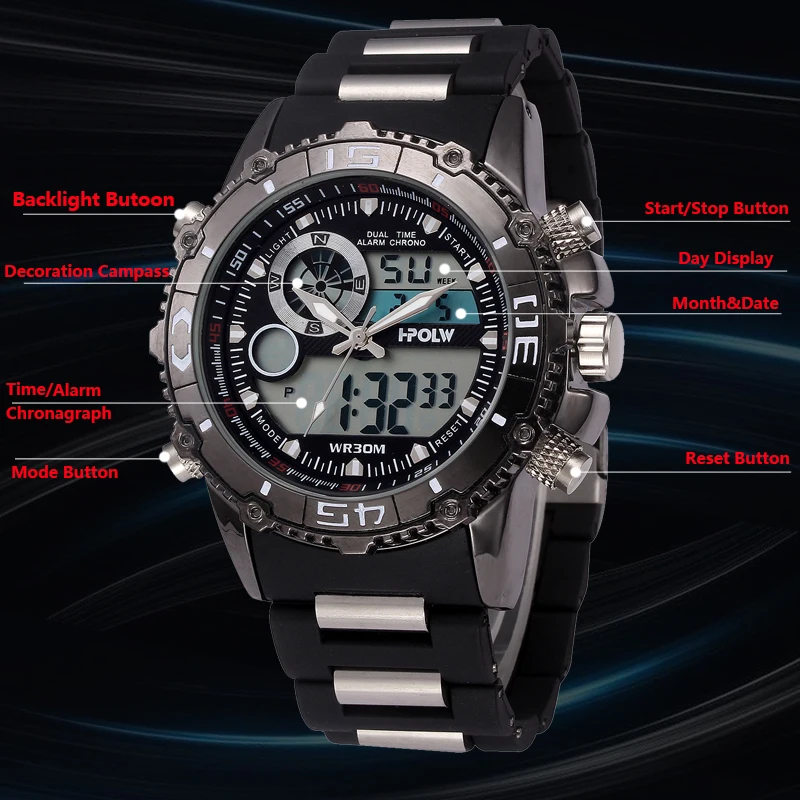 Feature:Water Resistant,LED display,Multiple Time Zone,Auto Date,Complete Calendar,Shock Resistant,Anti-magnetic,Alarm,Chronograph