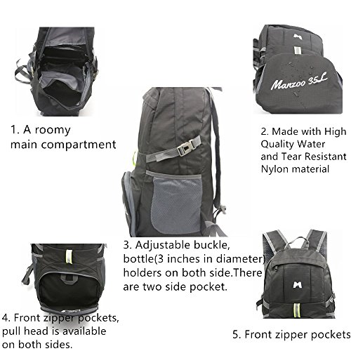 -. Brand : Manzoo -. EAN : 0704342124553 -. Feature : Material:The daypack backpack is made of high quality tear-resistant and water-resistant Nylon, its a ultralight daypack and ultrastrong also. / The backpack pouch dimension: Main pocket is 18.8x12x7.3 inches(WxHxD), The length of the shoulder straps is adjustable;The bag suitable to the person height from 4.5 feet up to 6.5 feet.You can see the daypack example on the MODEL, the model height is 6.1 feet. / Compact Structure: This foldable dayback features one main zipped compartment, two zipped front pockets and two side / Multipurpose usage: when you fold it, its a so small daypack,you can keep it anywhere, but when you open, actually it's a roomy bag,the main compartment provide enough room (35 liters) no matter if it's a day trip or a week long journey, organize all of your clothing,cell phone,cards,wallet organizer and water bottle easily. / Occasion:Its a carry on backpack which can be used everyday, you can use it as a backpack, travel bag or standby bag,very convenient to save your space and free your hand.when you are traveling,hiking and leisure life. -. IsAutographed : 0 -. IsMemorabilia : 0 -. MPN : 43188-255029 -. PackageQuantity : 1 -. PartNumber : 43188-255029 -. ProductGroup : Sports -. ProductTypeName : OUTDOOR_RECREATION_PRODUCT -. Title : Manzoo 35L Black Light Packable Travel Daypack Backpack Hiking for Men Women -. UPC : 704342124553