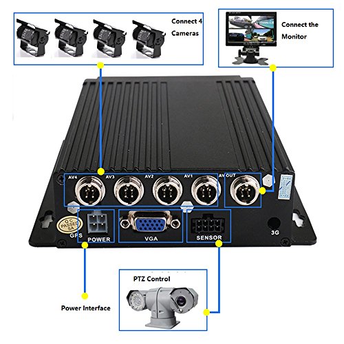 -. Feature : 720P Mobile DVR: No-seam recording technology. Support SD card (not included) up to 128GB, more convenient and vibration-proof than hard disk version. Compression Mode, Support four channel 4pin connector video and audio input, one channel AV connector video and audio output. IR remote control. / With 4pcs 18IR LED Waterproof camera: High-definition and wide viewing angle. Weatherproof/Waterproof, can be used both in car and home. / With 7 inch LED backlight color TFT LCD display monitor: Equipped with 2 AV input. AV1 connects to car DVD, VCR and other video equipment, AV2 to car backup camera. IR Remote control. / With 2pcs 5meters Male to Female 4 Pin Video Power Extension Cable and 2pcs 10meters Male to Female 4 Pin Video Power Extension Cable. / Note: Please remember to lock the SIM card slot with the key after insert the card. If not, the DVR will shut down automatically. Connect the Red and Yellow power cord to the positive electrode, and the Black power cord to the negative electrode. please test the voltage to see if it's between 9V-33V.