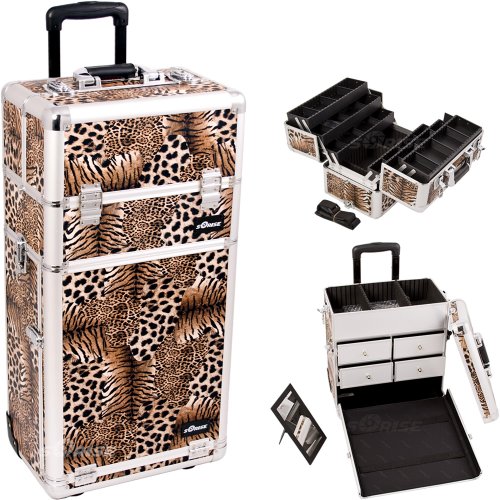 Sunrise I3462LPBR Leopard Professional Rolling Aluminum Cosmetic Makeup Craft Storage Organizer Case with Split Drawers and 6 Tiers Extendable Trays with Dividers