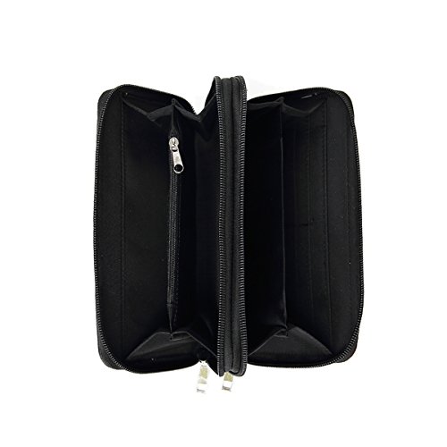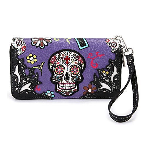 -. Brand : Cowgirl Trendy -. Department : womens -. Feature : Made from Vegan Leather - High Quality PU - with a Cotton/Polyester blend lining / Dimensions: 7.75"W x 4.5"H x 1"D / Dual Zipped Closures / 8 interior card holders, 4 per opening / Interior:2 check book pockets, 2 cash pockets, 1 zipped coin pocket for convenient organization -. ProductGroup : Shoes -. ProductTypeName : HANDBAG -. Title : Day of the Dead Sugar Skull Wallet - Colorful Cross, Flowers and Skull P.R.Int Wallet with Stud Accents