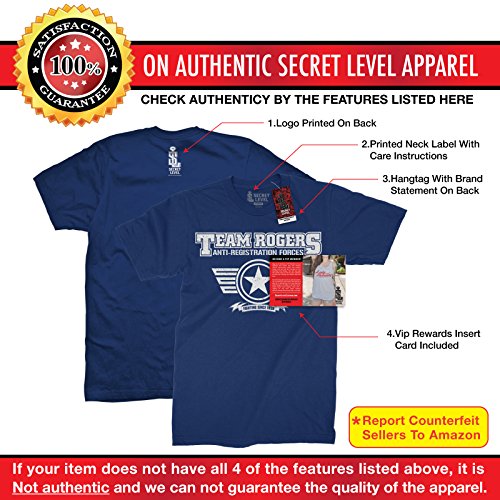 Binding : Apparel Product Description Secret Level Clothing Team Rogers T-Shirt Civil War Fans, represent your side of the Civil War with our new Team Rogers T-shirts. This durable light weight, vintage styled T-shirt is the perfect shirt to wear out on a night on the town, to work, or any other casual function. This Light weight tee is Pre-shrunk and made out of 100% ring spun cotton and is extremely comfortable to wear. The design is screen printed using Discharge Water Based Inks, to maintain a soft and breathable feel. Since the inks are water based, they are extremely eco-friendly for our environment and for you to wear. Secret Level Clothing Focuses on creating designs that appeal to pop culture genre's, such as: Comics, video games, movies, cosplay, zombies, anime, and fantasy without the designs looking like something kids wear. ?Be a kid at heart without looking like a kid. ?Subtle designs so you can wear anywhere, anytime. ?Fashion first look, so you can feel confident at all times ?Represent your favorite genre, but look like an adult while doing it! All Secret Level Apparel is 100% MADE IN THE USA and ships from within the USA. If your item is not shipping from the US, it is not authentic and we can not guarantee the quality Be aware of fake Chinese knock offs, as these are not real Secret Level Clothing. We take pride in premium apparel great customer service. All apparel is sent using Amazon FBA in order to deliver the apparel to you as fast as possible. Get the Secret Level Clothing Team Rogers Shirt delivered to your door by clicking on the "Add to Cart" button now. 0
