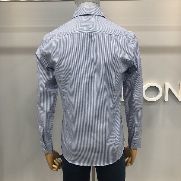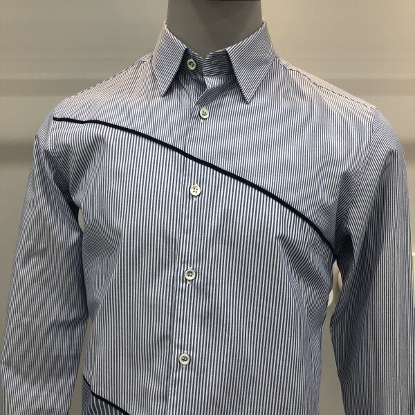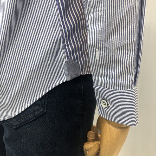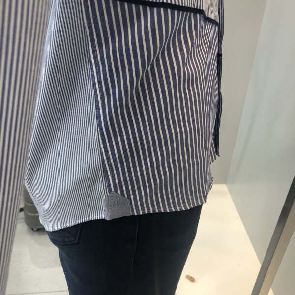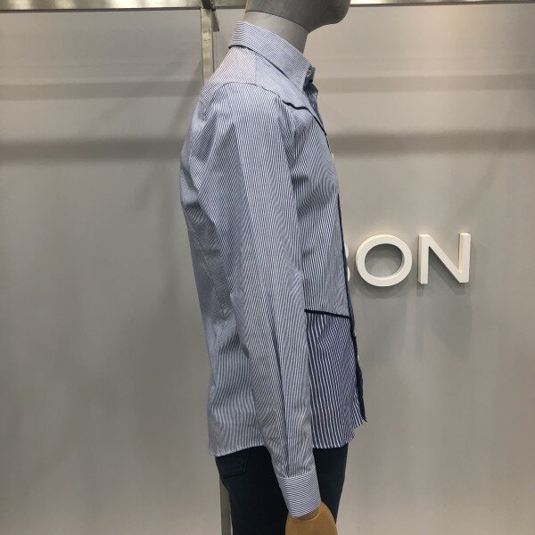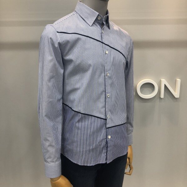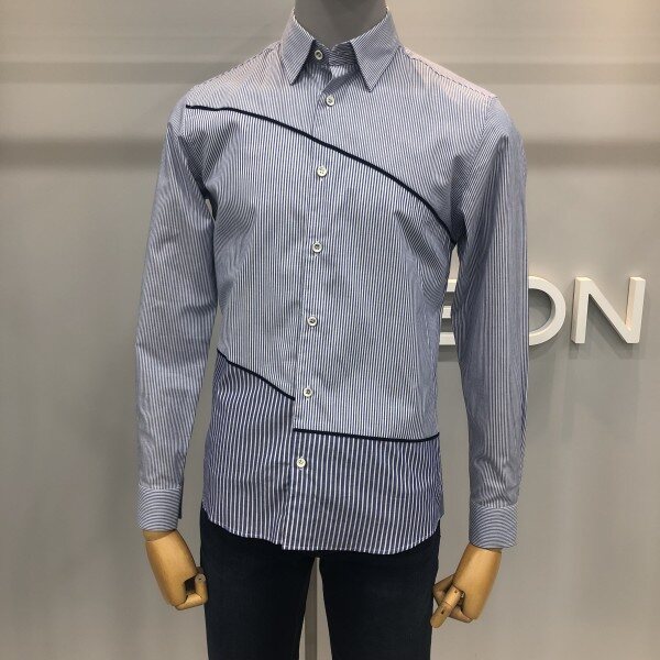 본 F/W 블루 스트라이프 절개 배색 셔츠 입니다.캐주얼한 배색 색감 조화가 너무 멋스러운 셔츠 입니다