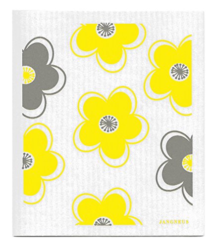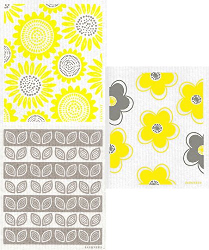 Swedish Dishcloth - (YB) Set of 3 YELLOW & GREY Flowers & Leaves